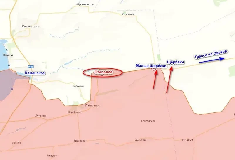 Село Степовое (Степное) относится к Васильевскому району Запорожской области. Сам поселок вытянут вдоль трассы на Орехов и состоит из одной улицы 9 Мая. Бои за данный населенный пункт начались буквально на днях, только вчера сообщалось, что штурмовые группы зашли в поселок с восточной стороны и начали продвижение, а сегодня об освобождении Степового официально сообщает Минобороны. Если считать Пятихатки, то это второй населенный пункт, освобожденный нашими войсками после довольно длительного перерыва.