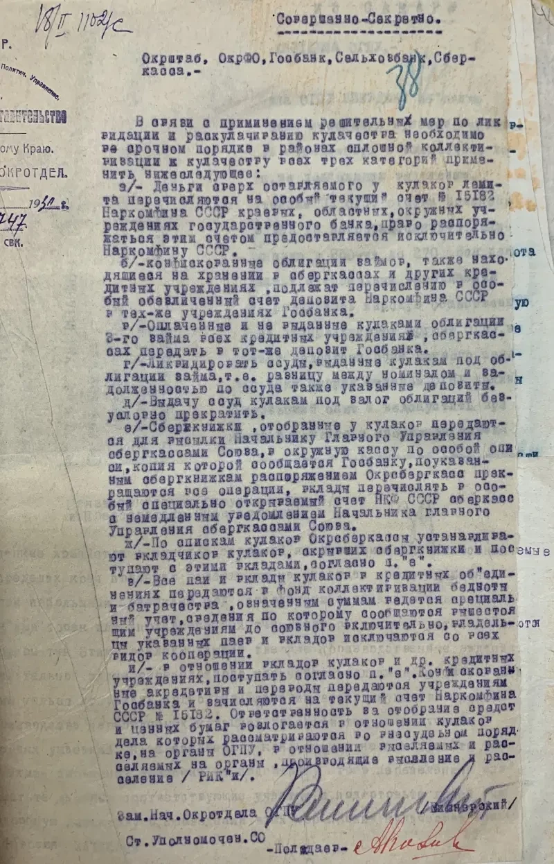 А еще у кулаков требовалось отнять не только все имущество (ну почти все), но и принадлежавшие им деньги и сберегательные книжки