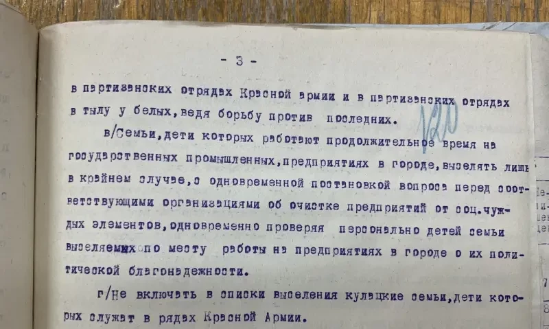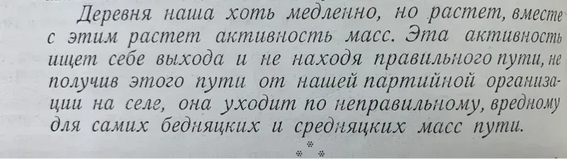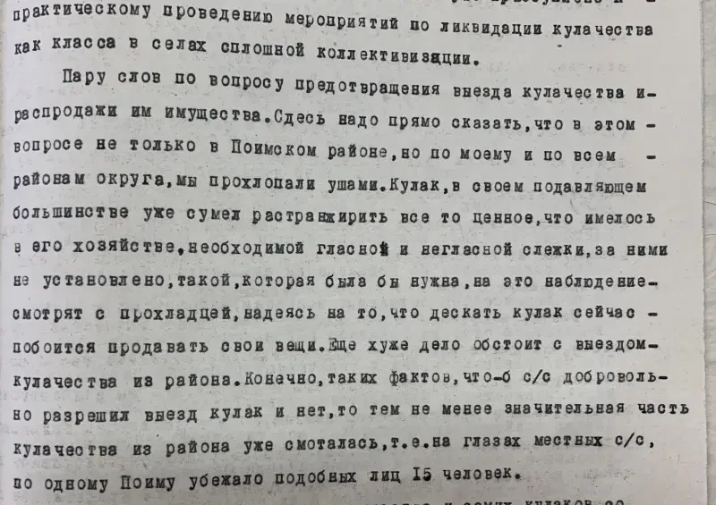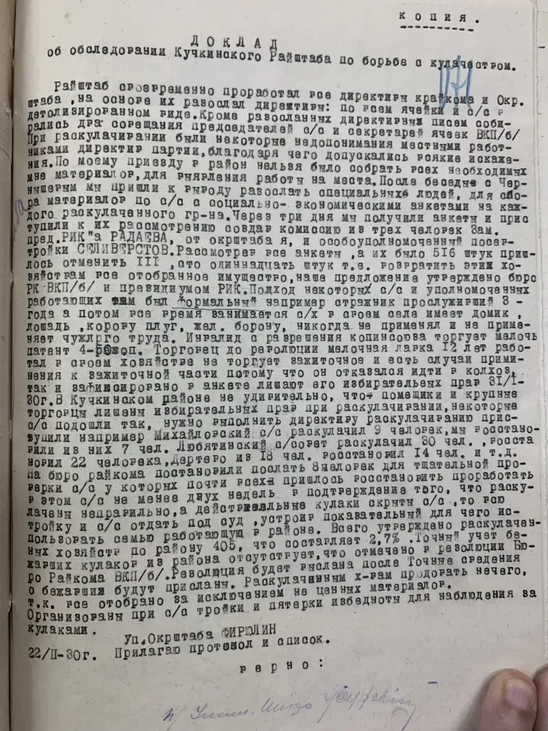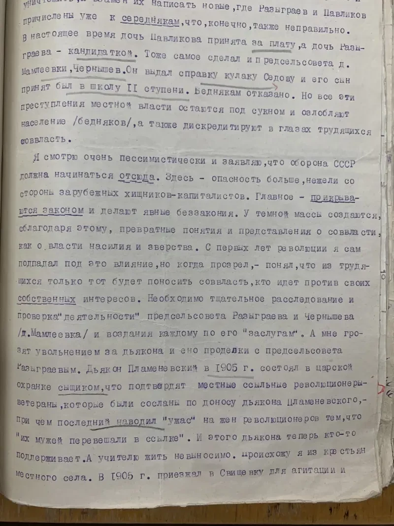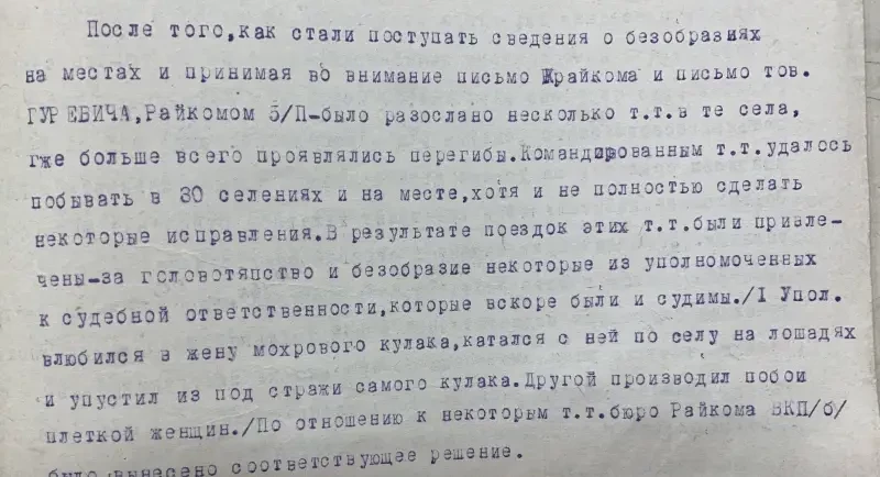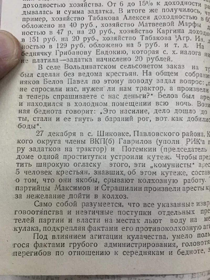Второй экземпляр этого же села Селиванов Давид Никифорович внесен в списки к выселению за то, что не внес наложенную на него сумму на трактора. Сам же он принадлежит к разряду бедняков, до революции работал батраком в имении Агапова, в прошлом и настоящее время исправный плательщик налогов и ярый защитник всех мероприятий сов. власти. Подобные факты свойственны каждому селу. Райком и Райштаб слишком несерьезно относились к тем процессам, происходящим на селе, не занимались проверкой присылаемого материала…»