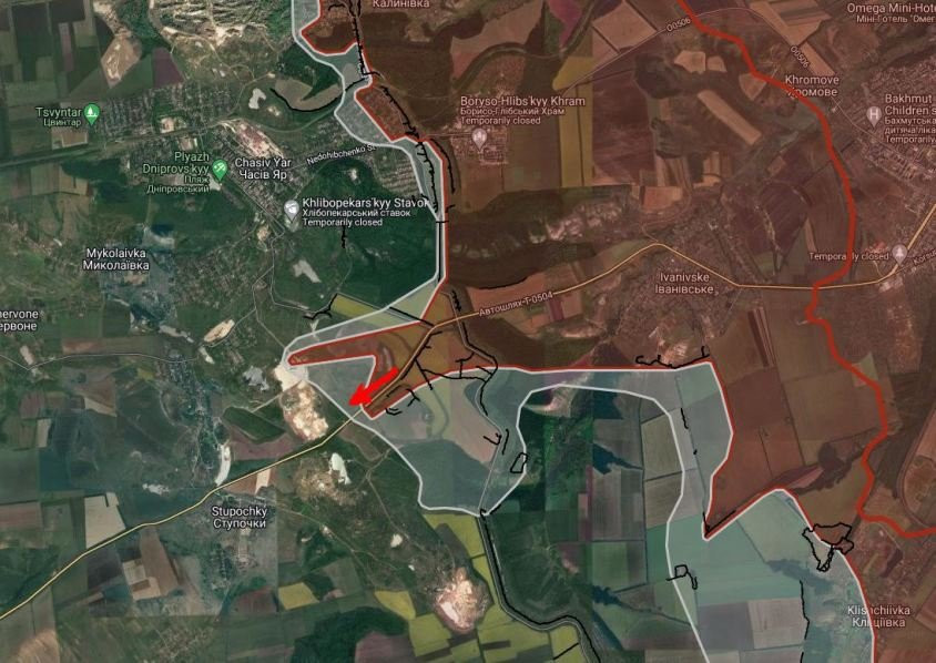 Российские войска продвинулись южнее Часового Яра вдоль автодороги Т0504 (Бахмут-Константиновка) на глубину до 1.05 км в направлении Ступочки.