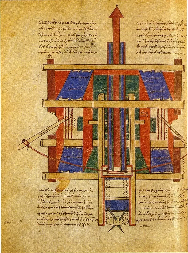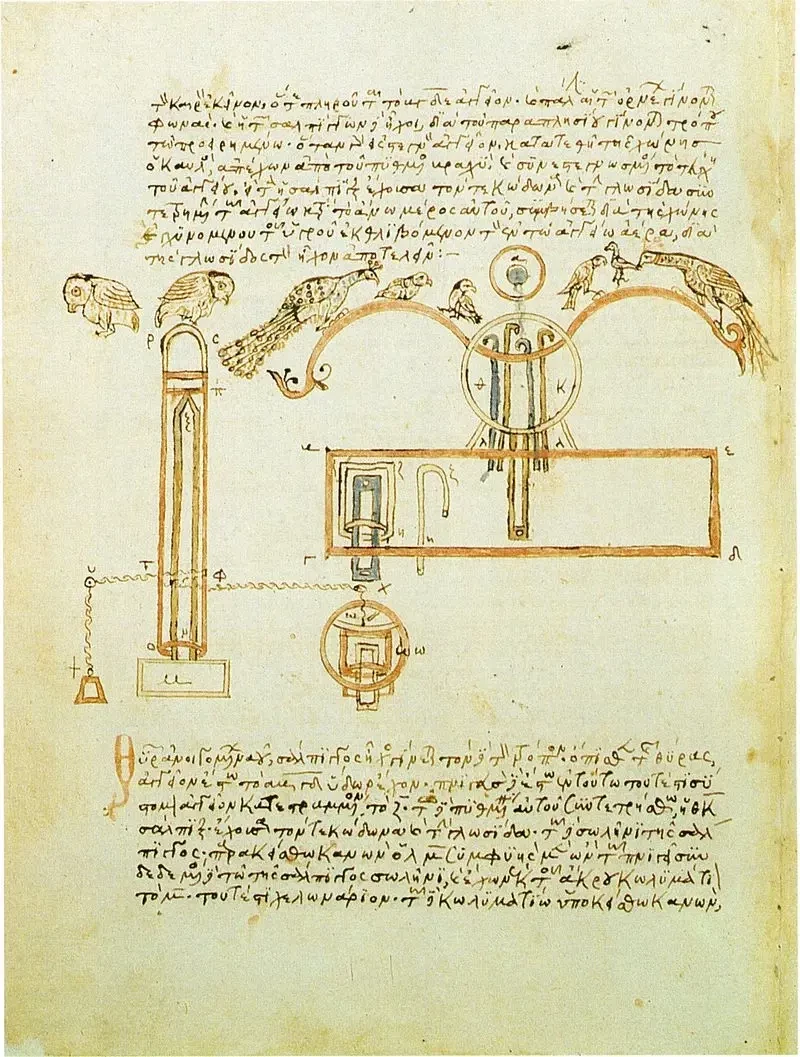 «Пневматика». Манускрипт Герона. Чертеж гидравлического аппарата для привода в действие поющих искусственных птиц. Библиотека Марчиана, Венеция