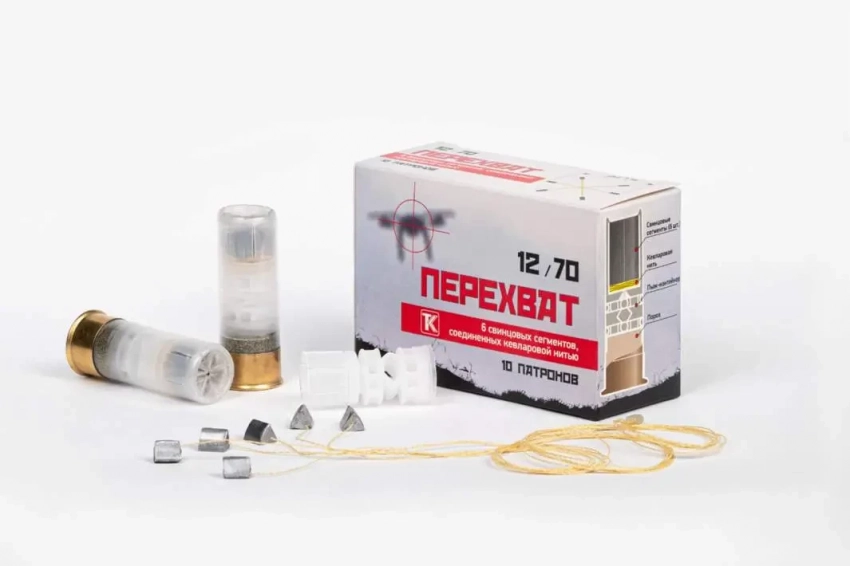 Применяются и более сложные решения. Так, в прошлом году компания «Техкрим» представила линейку ружейных патронов 12-го калибра «Перехват». В качестве поражающего элемента в них используется т.н. вязаная картечь. Каждый патрон содержит шесть картечин в виде треугольных призм, соединённых кевларовыми нитями. После выхода из ствола такая система раскрывается и образует шестиконечную структуру, способную повредить конструкцию цели, заблокировать её воздушные винты и т.д.