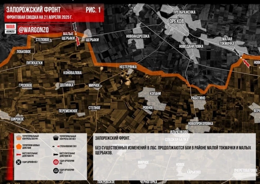 На Запорожском направлении линия боевого соприкосновения не притерпела существенных изменений. Здесь продолжаются бои в районе Малой Токмачки и Малых Щербаков.