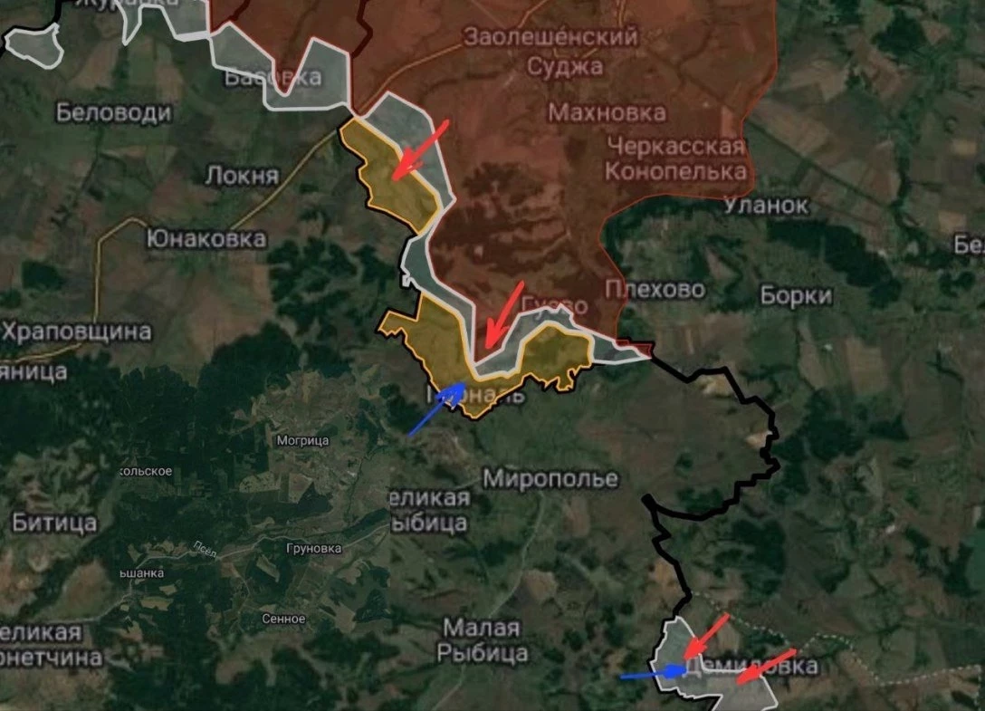 Кроме того, были поражены личный состав и военная техника ВСУ в Сумской области, удары наносились по населенным пунктам Беловоды, Вакаловщина, Великая Рыбица, Великий Прикол, Запселье, Малая Рыбица, Марьино, Садки, Юнаковка и Яблоновка. Отмечалось, что российские военные для поражения неприятеля применяли артиллерию, беспилотники и боевую авиацию.