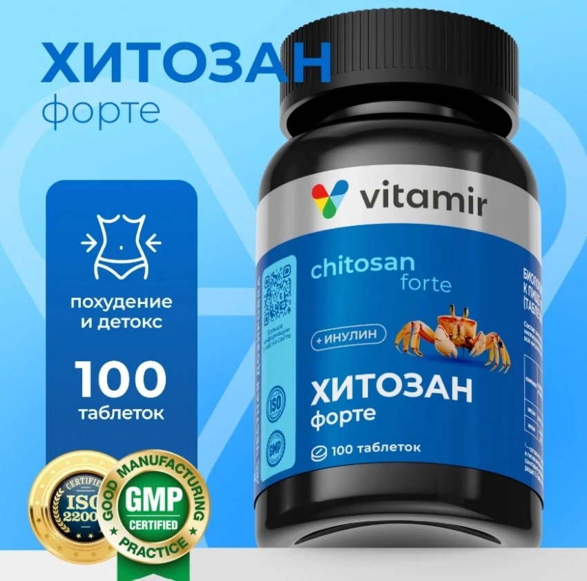 Хитозан форте VITAMIR PRO / БАД Хитозан для похудения и детокс очищение организма / 100 таблеток