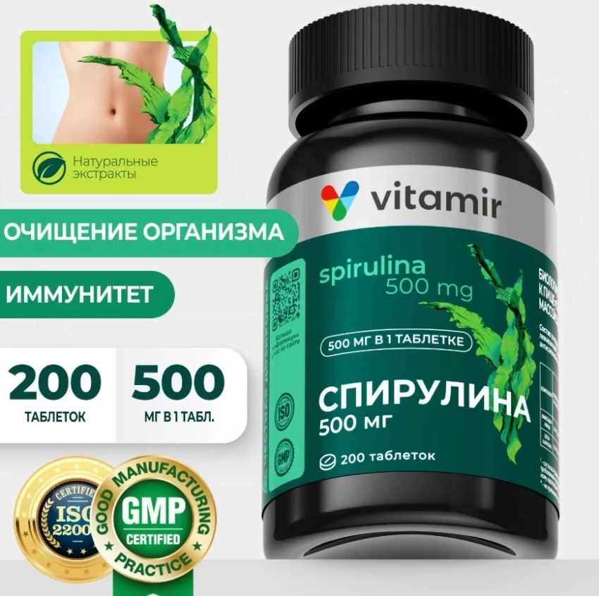 Спирулина 500 мг VITAMIR PRO / Спирулина таблетки для похудения / 200 таблеток