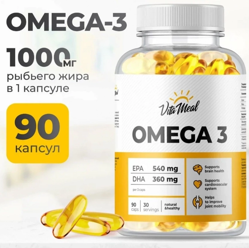 Омега 3 от VitaMeal — это один из топ бадов для похудения эффективных, который не только улучшает обмен веществ, но и помогает поддерживать здоровье сердечно-сосудистой системы, нормализовать уровень холестерина и поддерживать иммунитет. В составе — полиненасыщенные жирные кислоты омега-3, включая ДГК и ЭПК, полученные из рыбьего жира. Этот продукт подходит для людей, испытывающих физическую нагрузку или стресс, а также для тех, кто не получает достаточно рыбы в своём рационе. 3 капсулы в день — и вы обеспечите организму всё необходимое.
