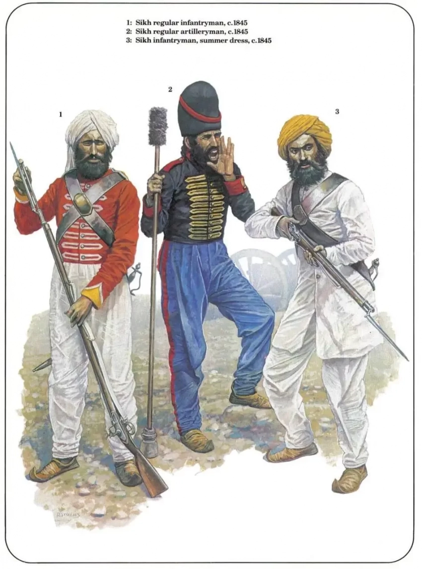 К началу Первой англо-сикхской войны «под ружьём» у владык Пенджаба было около 120-150 тысяч бойцов, в том числе где-то 72 тысячи — в составе регулярной армии. Именно с ними пришлось столкнуться армии Британской Ост-Индской компании. Что за противник был у сикхов — тема для отдельного разговора...
