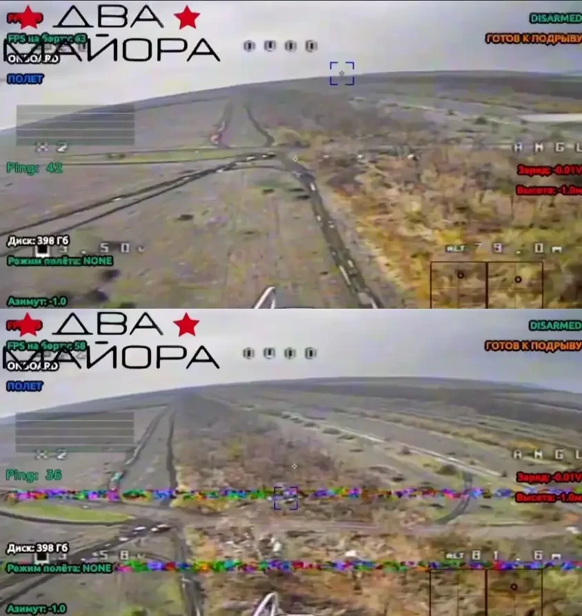 Судя по изображению, в эфире присутствовали какие-то помехи, возможно, воздействие средств РЭБ, однако существенного влияния они не оказали, и цель была успешно поражена. В опубликованной информации не раскрывается, каким образом обеспечивается связь между подсистемой оператора и подсистемой, осуществляющей ретрансляцию сигнала на FPV-дрон, так что здесь можно только гадать.