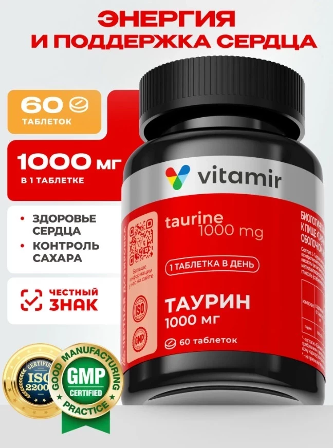 Таурин 1000 мг (Taurine) VITAMIR PRO / Бад для повышения энергии и выносливости / 60 таблеток