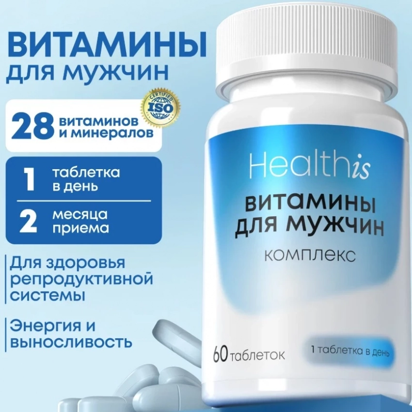 Витаминно-минеральный комплекс для мужчин от HealthIs — это мощная поддержка для активных мужчин, направленная на улучшение умственной и физической активности. Состав, включающий витамины группы B, магний, цинк, йод, витамин D3 и кальций, помогает поддерживать гормональный баланс, улучшает обмен веществ, укрепляет иммунную систему и защищает от стресса. Лютеин и ликопин поддерживают здоровье глаз и предстательной железы, а антиоксиданты, такие как витамин E, защищают клетки от повреждений.