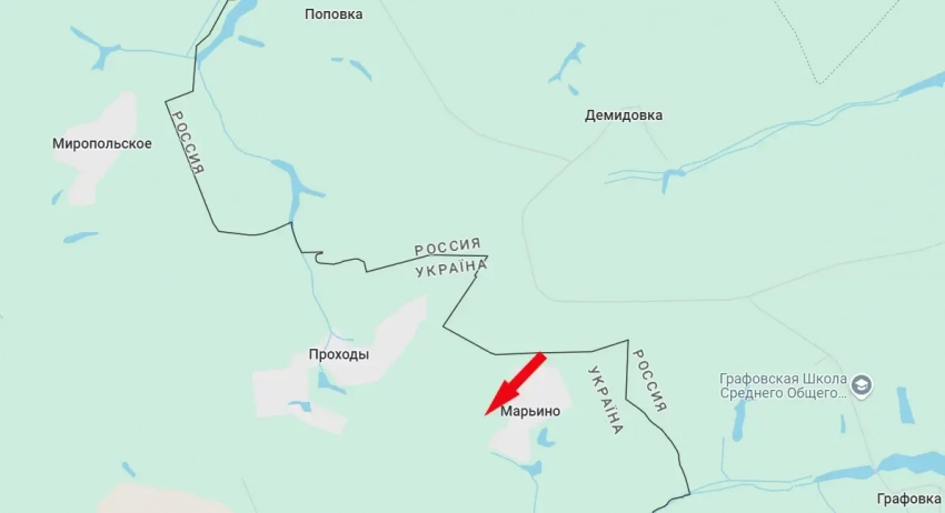 Речь идёт о посёлке Марьино, который расположен в непосредственной близости от границы – юго-восточнее транспортно-логистического узла ВСУ в Мирополье. Есть в Сумской области и ещё одно Марьино, расположенное к западу от Юнаковки. До него ВС РФ не доходили.