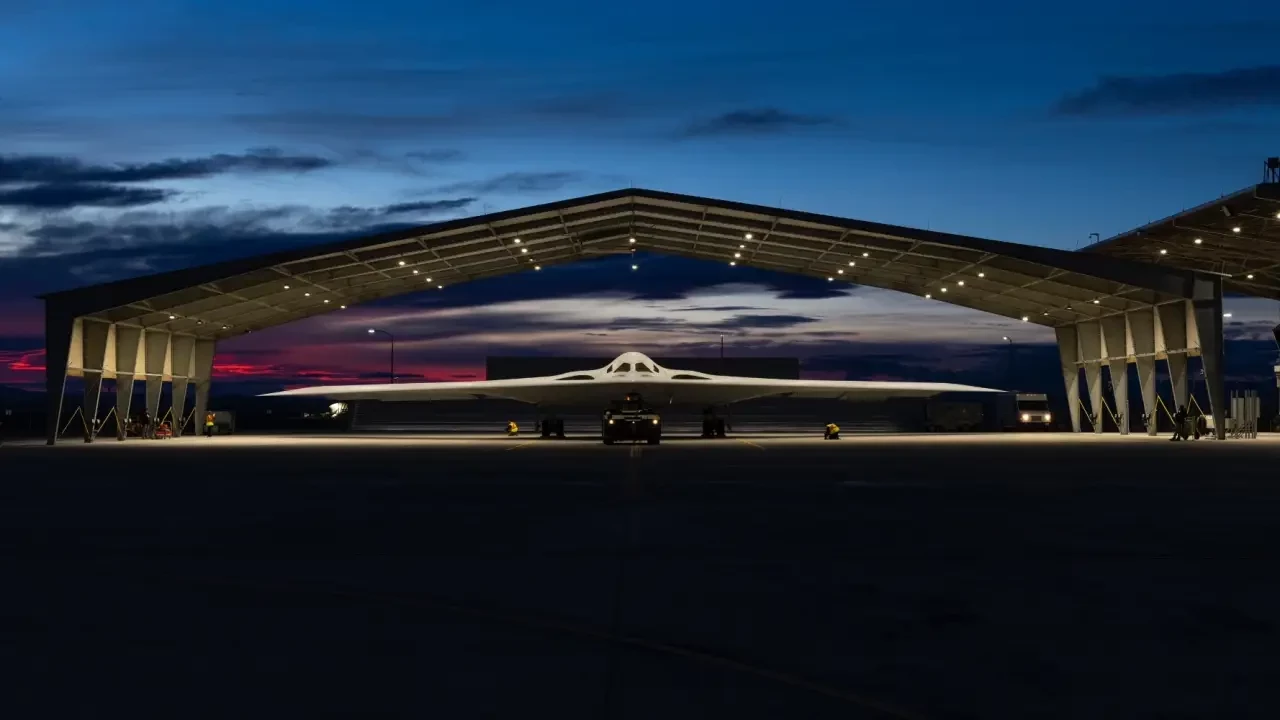 B-21 Raider на объекте Northrop Grumman на авиабазе Эдвардс, Калифорния. B-21 — это недавно раскрытое воплощение концепции летающего крыла Джека Нортропа. Предназначенный для замены бомбардировщиков B-1 и B-2 в текущем составе ВВС США, B-21 — это дальний бомбардировщик, способный проникать в воздушные пространства вероятного противника и нести как обычные, так и ядерные боеприпасы.