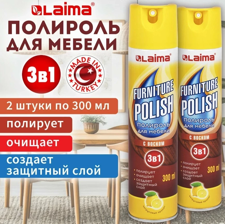 Полироль для мебели с воском и антистатиком 3 в 1, спрей аэрозоль 300 мл набор 2 штуки, чистящее средство для уборки пыли, антипыль, Laima, 881134