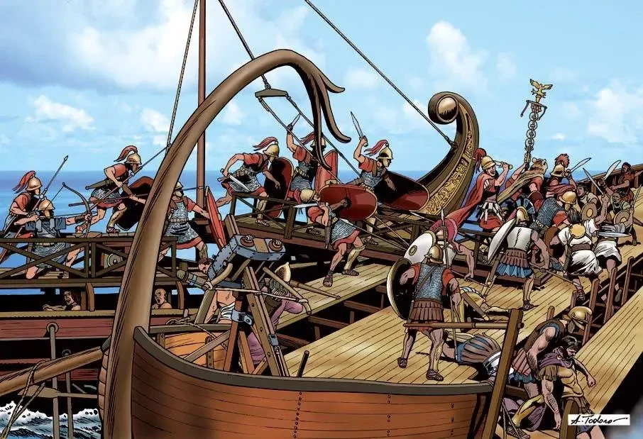 Римские солдаты идут на абордаж пунийского корабля, перекинув на него мостик «корвус». Иллюстрация Анжело Тобаро