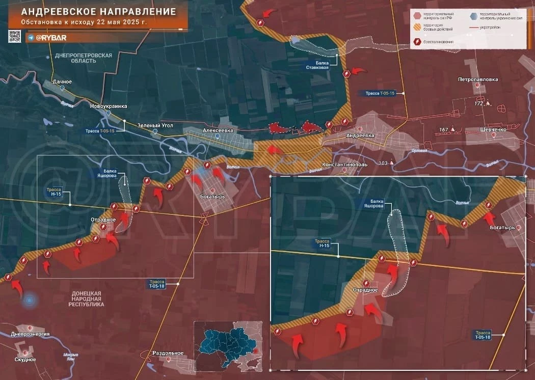 На Угледарском фронте интенсивные бои в Новополе и Зелёном Поле. В обоих сёлах под контролем ВС РФ не меньше трети территории. Отсюда остается 2 км до стыка между Донецкой, Запорожской и Днепропетровской обл. Восточнее Фёдоровки тяжёлые бои в направлении на Комар. В Отрадном ВС РФ зашли в южную и восточную части, начался штурм села. Противник контратакует на бронетехнике у Отрадного и Богатыря, несёт потери. Западнее Отрадного начались встречные бои на подходах к Комару.