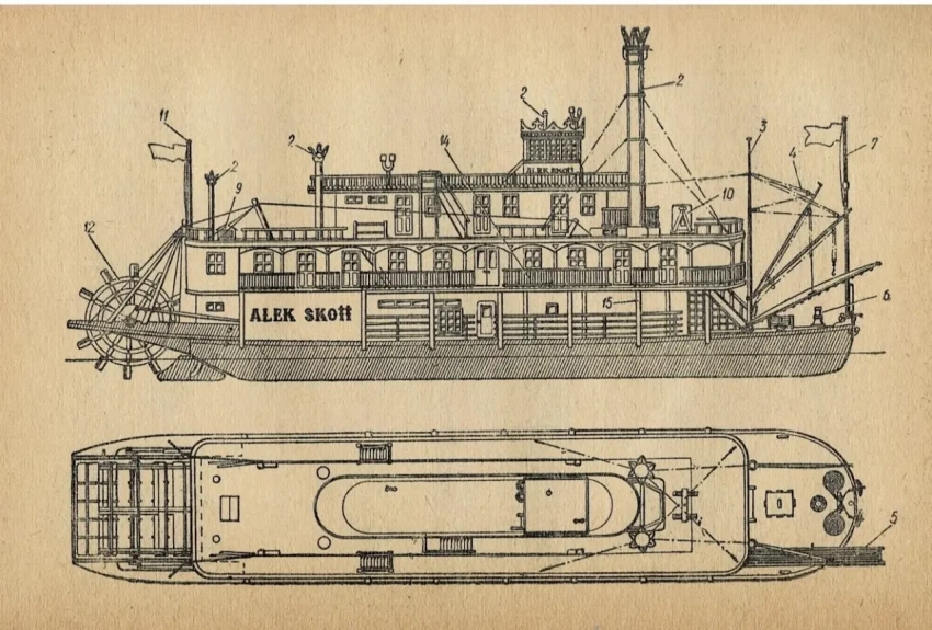 И вот тут в 1968 году в кинофильме «Приключения Тома Сойера» (1968), снятого Румынией, Францией и ФРГ, с отличным советским дубляжом, я его и увидел. И хотя в этом фильме «пароход Тома Сойера» был маленьким и довольно бутафорским, это было хотя бы что-то. Причем особенно меня впечатлили его резные трубы… В советском кинофильме 1971 года пароход сделали побольше, но тоже… Какой-то был он странный и не впечатляющий. Но как бы там ни было, захотелось узнать о таких пароходах побольше, и вот тут-то мне в руки и попала книга «От драккара до крейсера» М. Михайлова и О. Соколова 1975 года издания с чертежами модели американского речного парохода «Алек Скотт».
