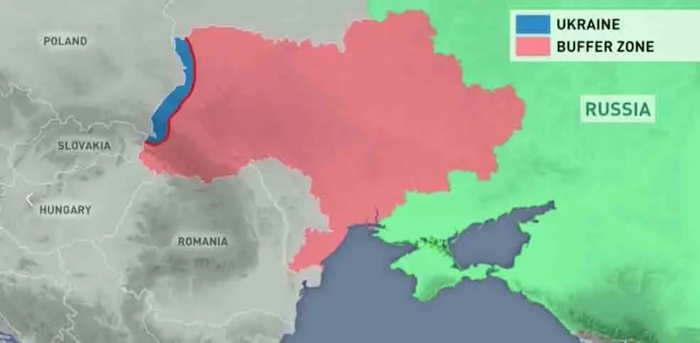 На карте красным помечена будущая буферная зона при условиях, обозначенных Медведевым. От самой Украины остаётся узкая полоска в виде Закарпатской, Львовской и Волынской областей, да и то, судя по указанным на карте Медведевым размерам, - частично.