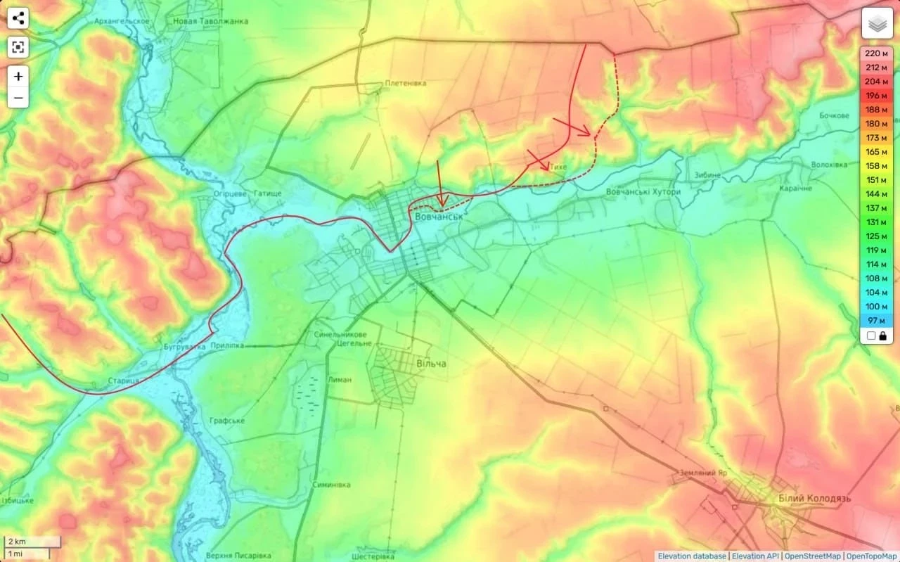Таким образом мы видим следующую картину: российские войска идут довольно широким фронтом и за последнюю неделю продавливание фронта противника здесь заметно ускорилось. Это является следствием того, что на Сумское направление были переброшены дополнительные резервы.