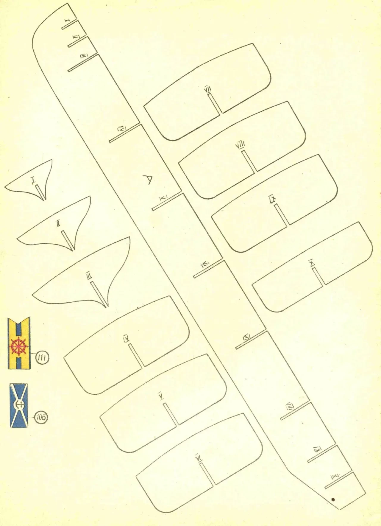 Затем вырезать днище — самая короткая часть на теоретическом чертеже справа вверху, и палубу — самая широкая и длинная часть на этом же чертеже. Понятно, что высота продольной переборки должна учитывать толщину ламелей днища и палубы! Для простоты и облегчения работы и днище, и палубу можно разрезать пополам, а переборку вклеить уже между ними!