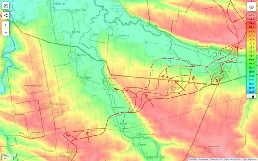 Также наши части продолжали вчера зачищать посадки западнее Отрадного и постепенно идут к восточным окраинам н.п. Комар. С учетом того, что Комар находится в долине и перепад высот там с восточных окраин очень большой (более 20 метров и село с них видно как на ладони), с выходом наших штурмовиков на эти самые восточные окраины гарнизон противника в селе будет приговорен, констатирует Подоляка.