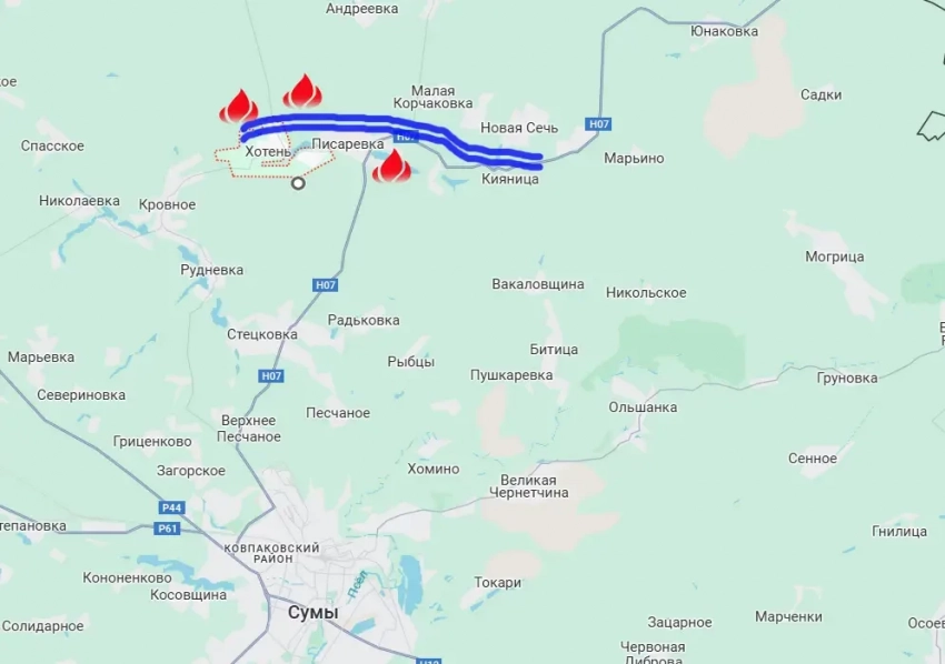 При этом взрывы гремят на объектах в Сумской области. Там сообщается о прилётах как дронов типа «Герань», так и авиационных бомб с модулями планирования и коррекции. Удары наносятся по скоплению сил противника, а также по военному транспорту в районе населённых пунктов Хотень и Писаревка. От них до северной окраины Сум около 12 км. При этом линию Хотень-Писаревка-Иволжанское-Кияница противник пытается превратить в северный рубеж обороны областного центра – города Сумы. Однако сделать это ВСУ совсем не просто. Обустройство линии обороны приходится проводить под постоянными ударами дронов, обстрелами артиллерии и прилётами ФАБ с УМПК. Ещё и при учёте того, что к ней на расстояние около 4-5 км подошли сухопутные силы России.
