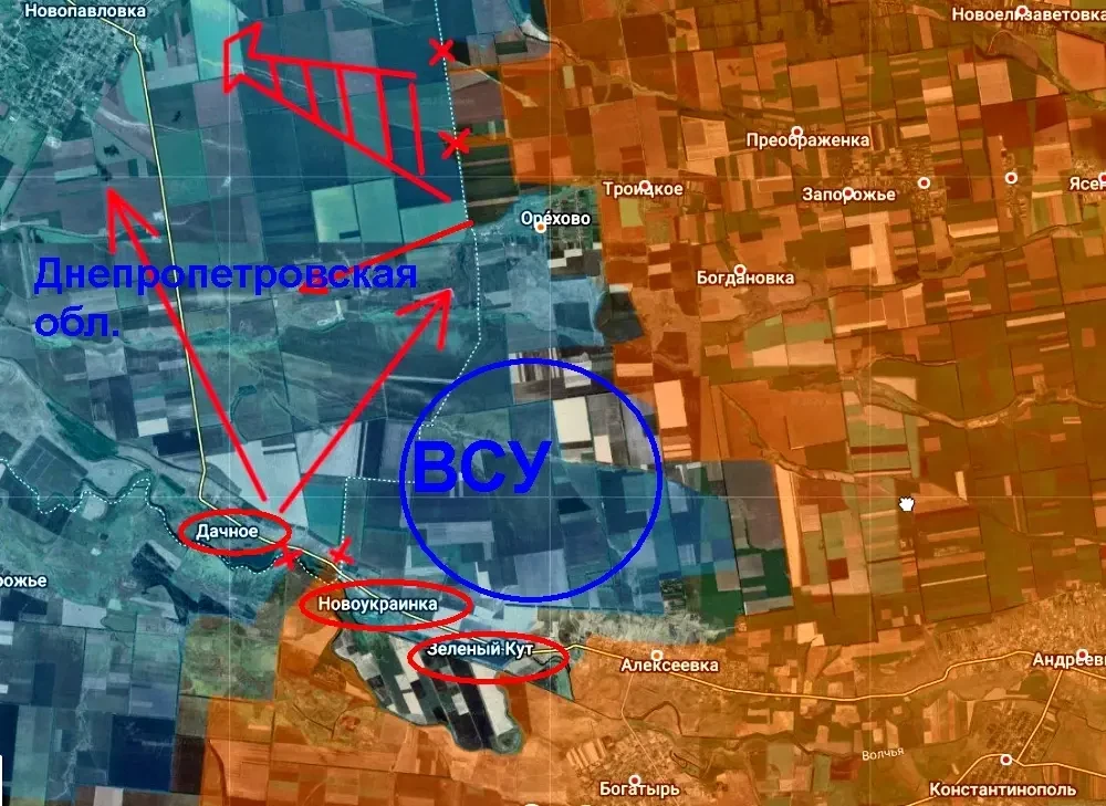 На этом наши бойцы не остановились и двигаясь вдоль реки Волчья по трассе вошли в соседнюю Днепропетровскую область в Синельниковском районе в направлении села Дачное. Прорыв произошел вдоль трассы Алексеевка-Межевая севернее направления предыдущего удара. Таким образом можно наблюдать очередную реализацию тактики «цветка», когда ВС РФ ударами в разные стороны прощупывают оборону противника, находят слабые места и продвигаются там.