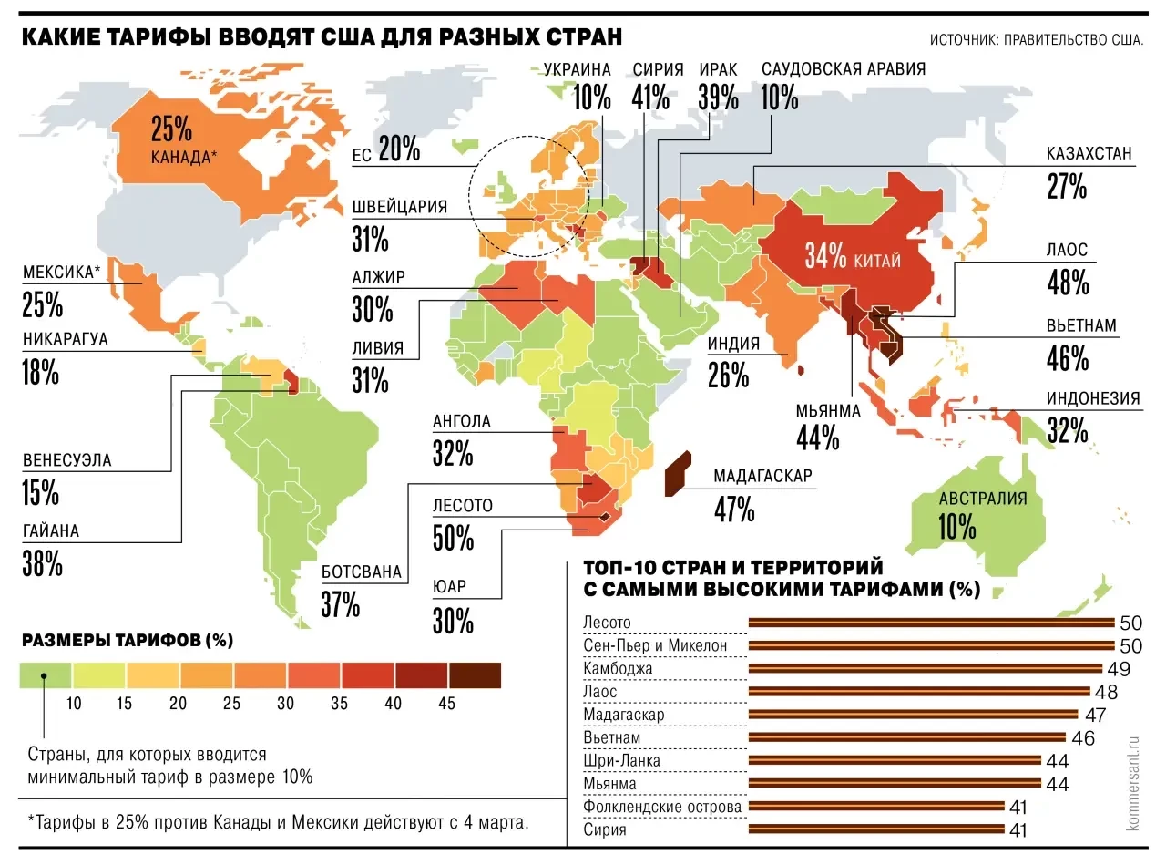 Так, пошлины США в отношении ЮАР установлены в размере 30%, Ботсваны – 37%, Зимбабве – 18%. А в отношении Мадагаскара и Лесото они максимальные: 47 и 50%.