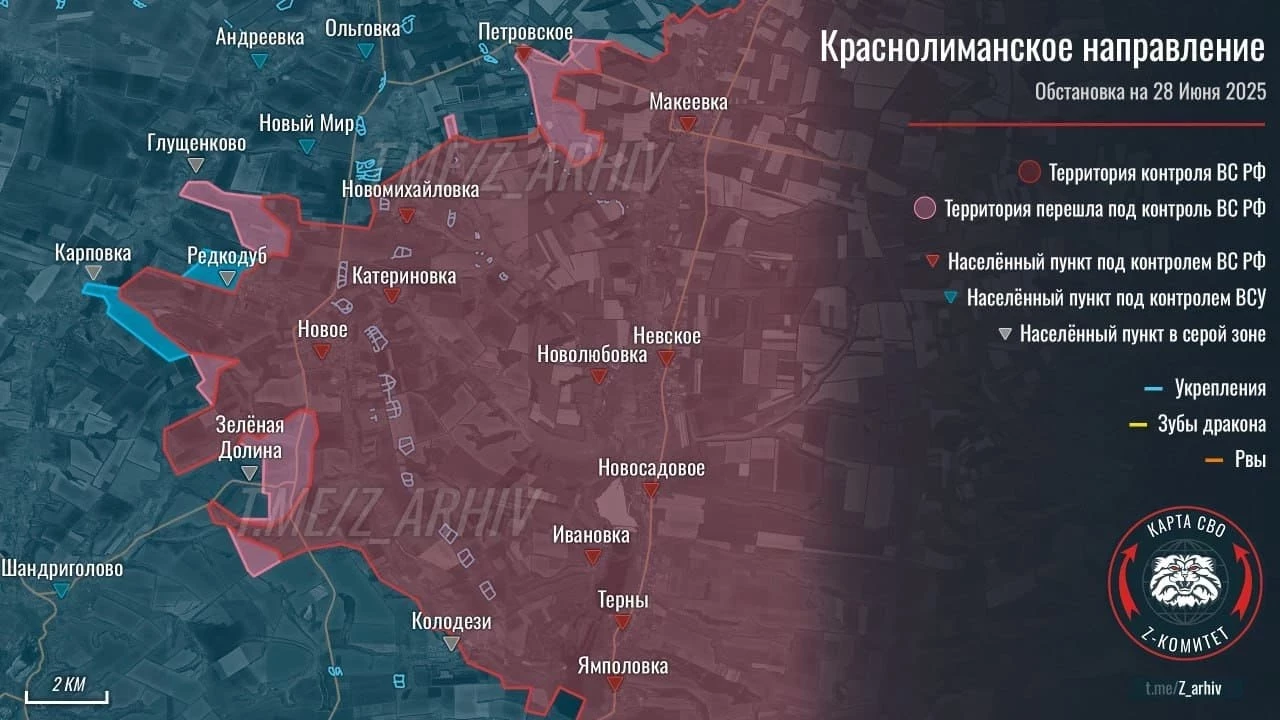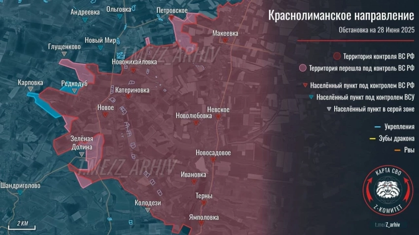 На Краснолиманском направлении российским подразделениям пока не удаётся установить контроль над Колодезями, там продолжаются ожесточенные бои. Наши бойцы обходят по флангам Зелёную Долину. При этом противник, пытаясь снизить интенсивность российского наступления на Карповку и Новый Мир, навязывает встречные бои в районе Редкодуба. Не смотря на это наши военные смогли закрыть «карман» между Новым Миром и Новомихайловкой.