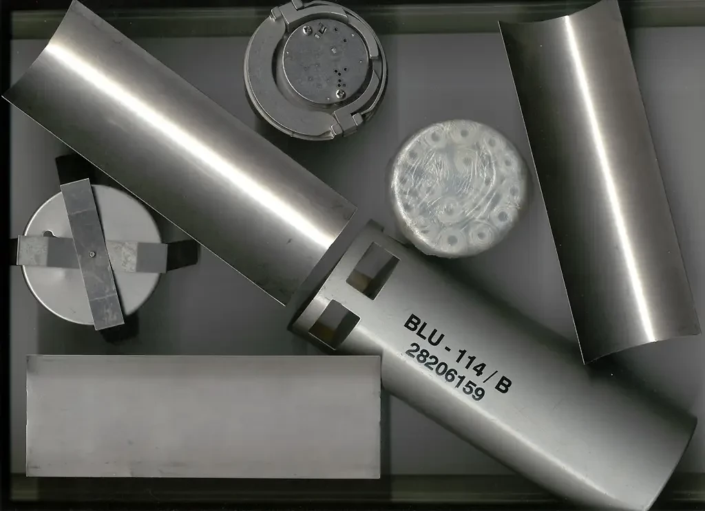 Боевой элемент BLU-114/B американского производства. С маркировкой — изделие в сборе. Рядом с ним лежат элементы корпуса. Выше — полупрозрачный пакет с катушками графитовой нити