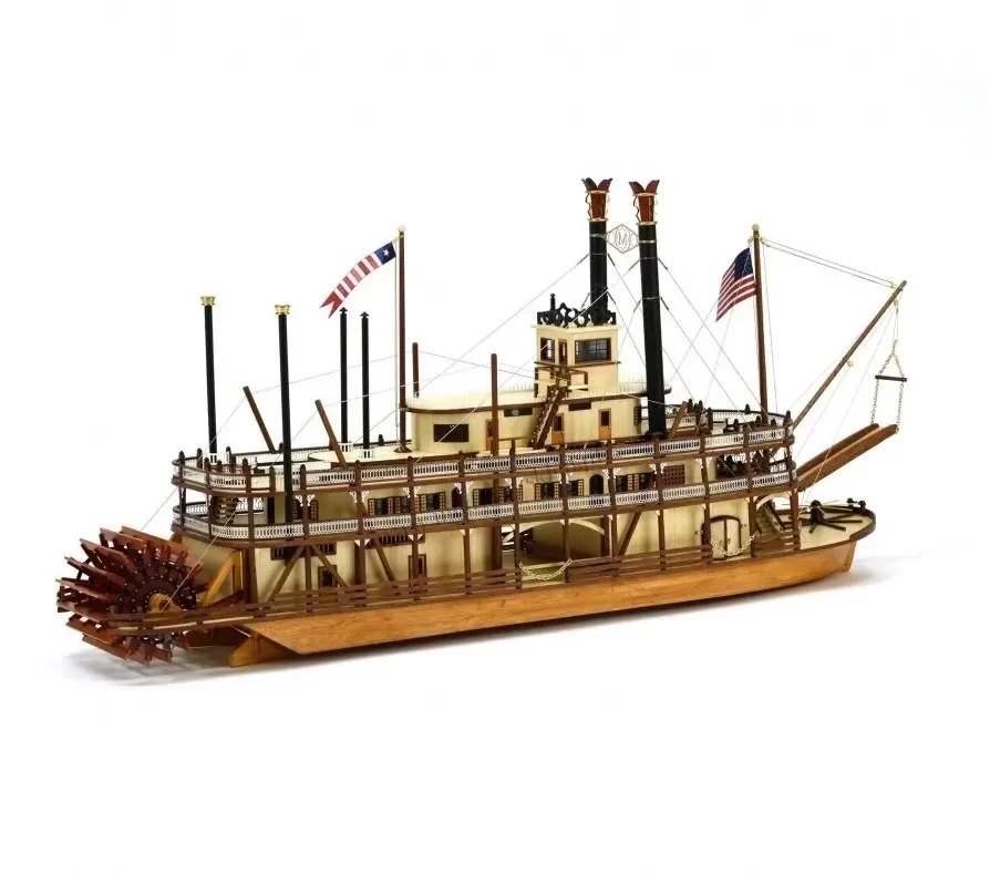Интересным образом подошли к теме моделирования миссисипских пароходов в отечественной компании «Семейная фотостудия» из Санкт-Петербурга. Они взяли за основу бумажную модель фирмы «ДрафМодел» из их журнала № 1 за 2009 г. и весь силовой набор корпуса и палуб изготовили из тонкого, но прочного картона, методом лазерной резки. То есть эти детали просто выдавливаются из картонных листов, а затем уже на них наклеиваются цветные элементы из бумаги. Хотя, разумеется, большая часть деталей парохода так бумажными (в силу их масштабной толщины!) и осталась. Журнал с цветными развертками плюс лазерная резка стоят 1600 р., что вполне соответствует ожидаемому качеству. Кстати, и бумага, на которой напечатаны детали модели, значительно лучше той, что использовалась поляками в «Малом моделяже» в прежнее время. Масштаб модели 1:100.