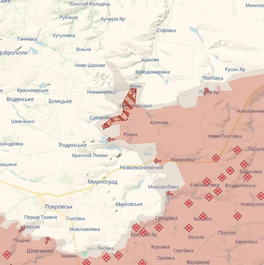 Кроме того, эксперты пишут о новом направлении наступления подразделений ВС РФ от населённого пункта Маяк, расположенного к северо-востоку от Покровска, в северном направлении. Что характерно, на карте противника «серая зона» дошла уже до Нового Шахово. Это может свидетельствовать о том, что наши бойцы подошли к окрестностям данного села.