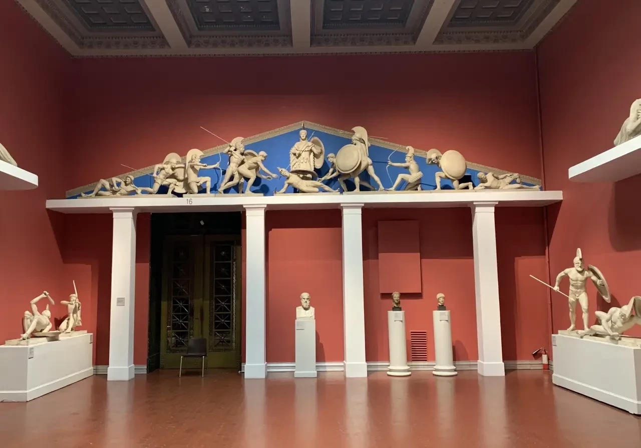 Переходим в залы со скульптурами Древней Греции, и там их столько, что просто разбегаются глаза. Но начнем мы с реконструкции западного фронтона храма богини Афины в Ахайе на острове Эгина. В Пушкинском музее его можно увидеть как целиком, так и в виде отдельных скульптур, входящих в его общую композицию. Вот так он выглядел в дни «своей молодости»…
