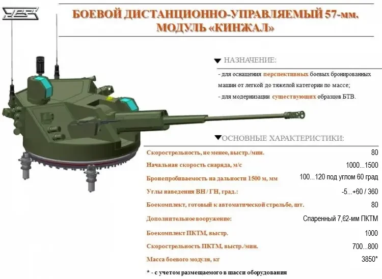 Основное вооружение новой ТБМП — это автоматическая пушка калибра 75-мм с высокими начальной скоростью и дульной энергией снаряда. Она должна быть оптимизирована на максимальную эффективность для борьбы с любыми целями на дальности до 2-3 километров. Угол вертикального наведения должен быть ограничен пределами от -5 до +25 градусов. При наклонной дальности 2,4 км поражение воздушной цели может быть обеспечено до высоты 1000 метров, а это, между прочим, граница между малыми и средними высотами по понятиям ПВО, и не следует отнимать хлеб у подразделений войсковой ПВО за счёт увеличения высоты башни ДУБМ ТБМП и ухудшения точностных характеристик.