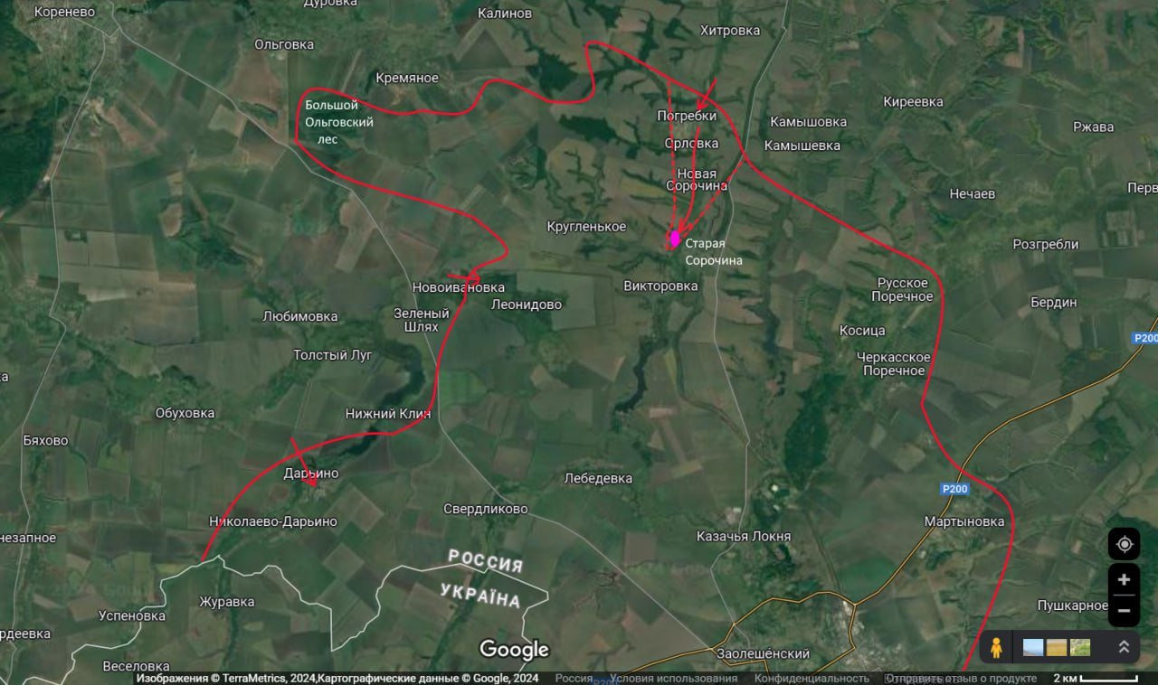 Военный обозреватель прямо сейчас сообщает, что подтвержден прорыв наших войск с севера через Погребки на юг. Колонна 810-й бригады, движущаяся на бронетехнике, не встречает сопротивления и уже прошла Старые Сорочины, обходя Малую Локню с запада. Это указывает на дальнейшее движение на юг и попытки вернуть контроль над Новоивановкой и Викторовкой. Командование стремится отрезать части противника к северу от трассы Зеленый Шлях - Малая Локня. Также продолжается атака в районе Дарьино.