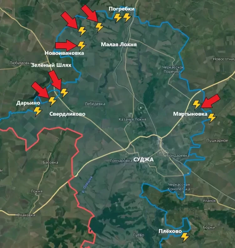 В свою очередь PulsePen информирует о том, что в настоящее время продолжаются бои практически по всему западному участку на Курском направлении. Встречные бои идут восточнее Новоивановки, в районе Погребков, южнее Зелёного Шляха - в районе трассы на Суджу, близ Дарьино и Николаево-Дарьино. Существенных изменений ЛБС не зафиксировано.