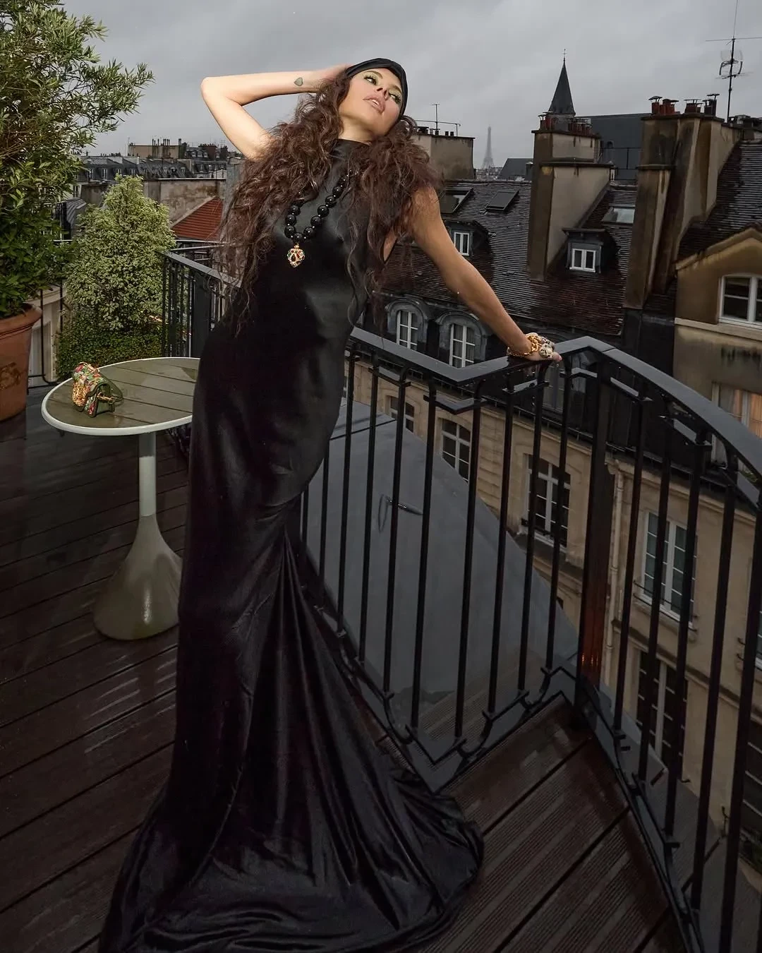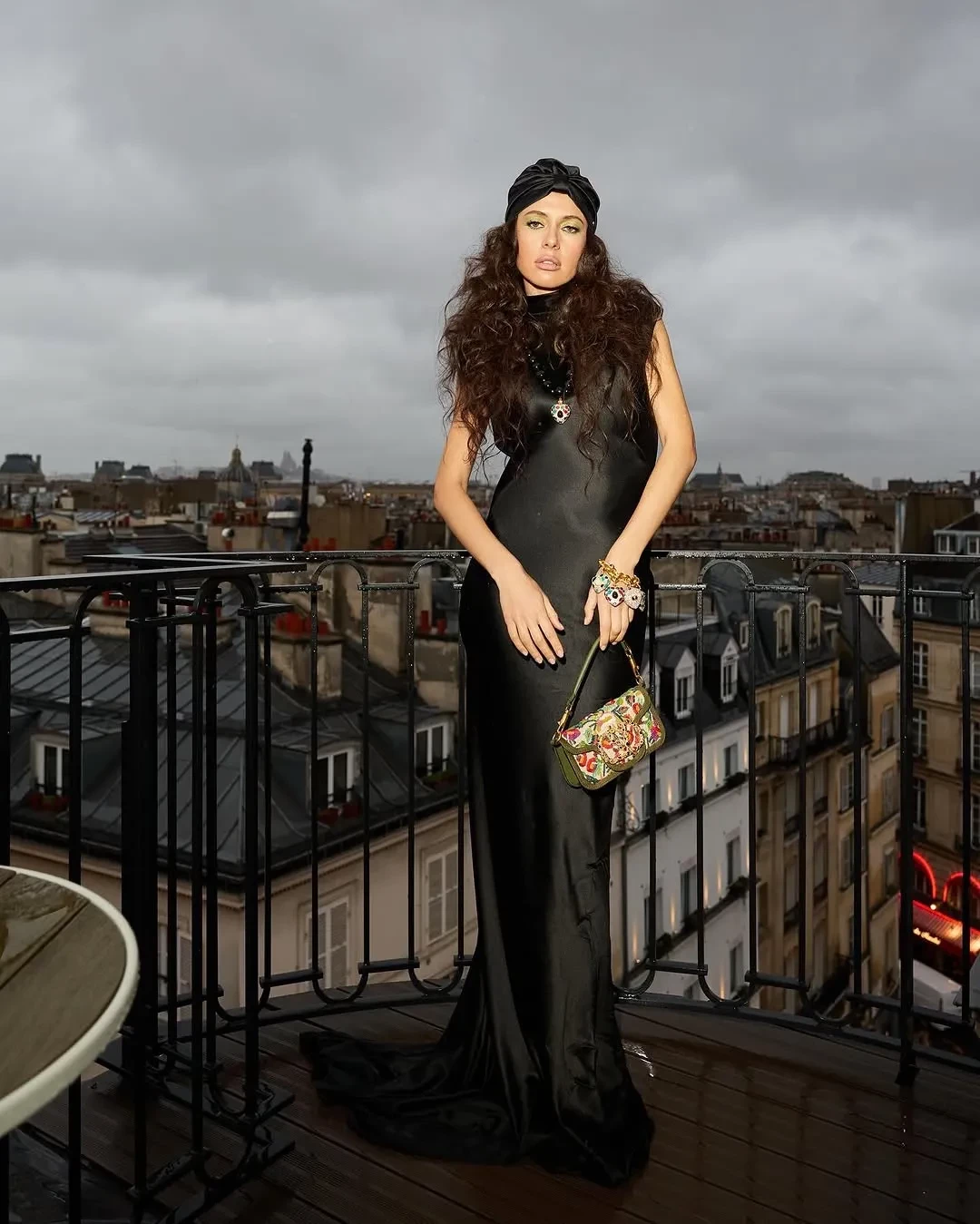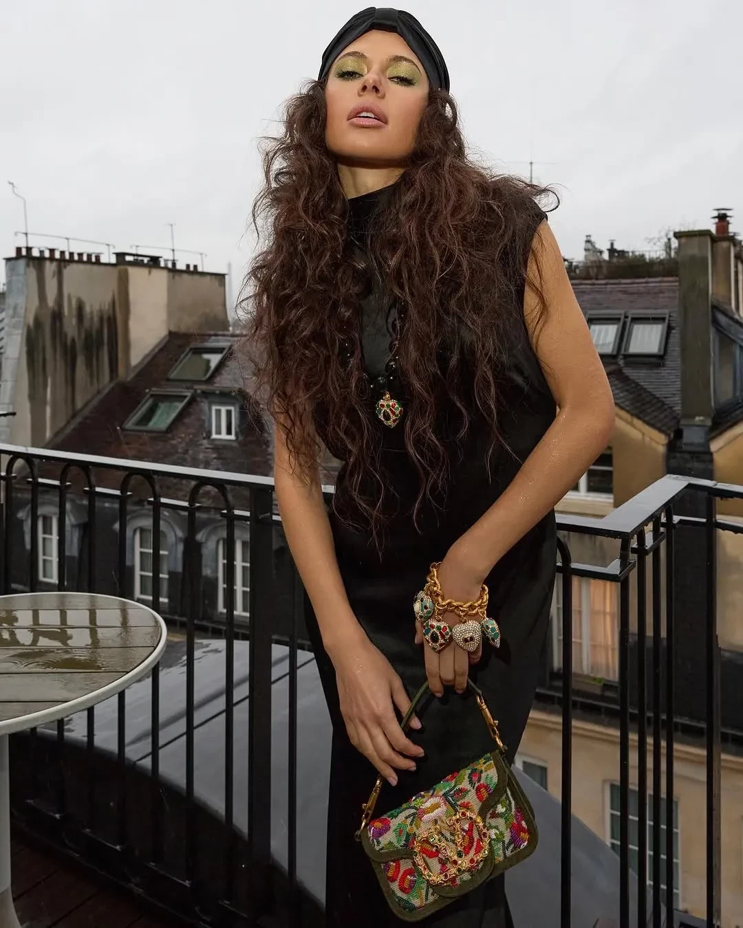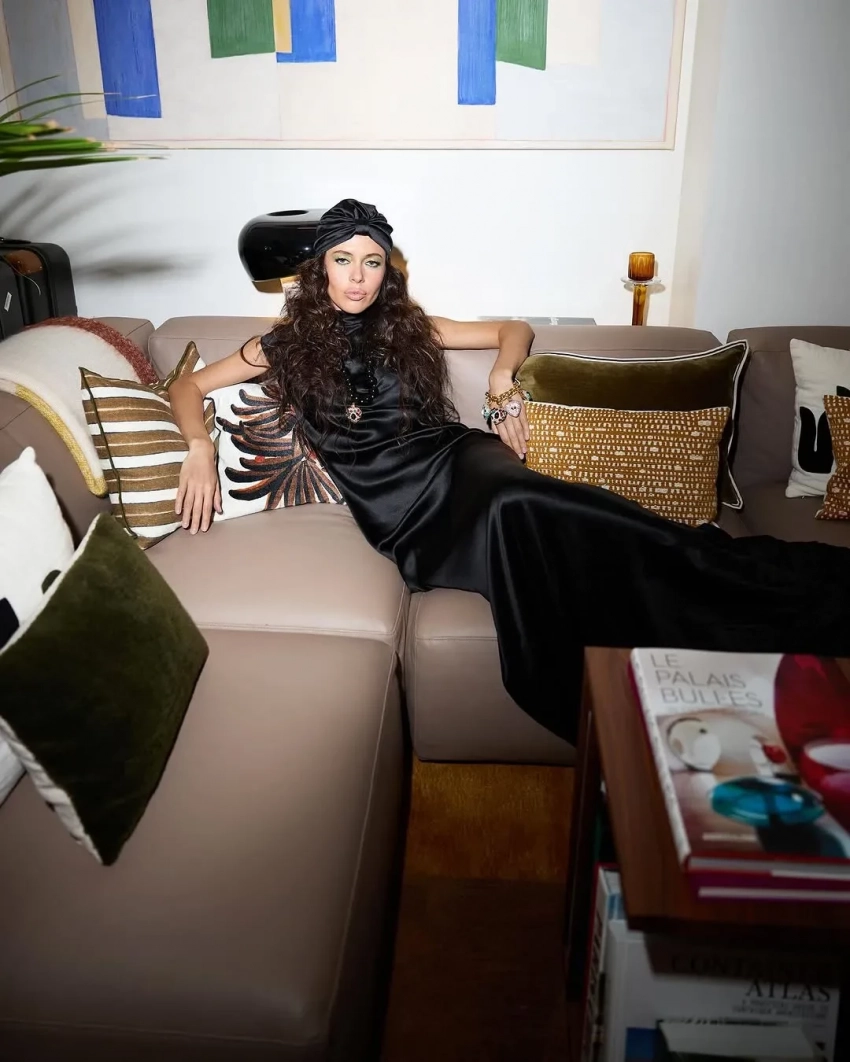 Ксения отправилась на шоу в длинном чёрном платье бренда Александра Терехова Sashaverse, в котором она на днях появилась на показе Schiaparelli. Стилист блогерши Ксения Смо дополнила образ сумкой, чалмой и украшениями Valentino.