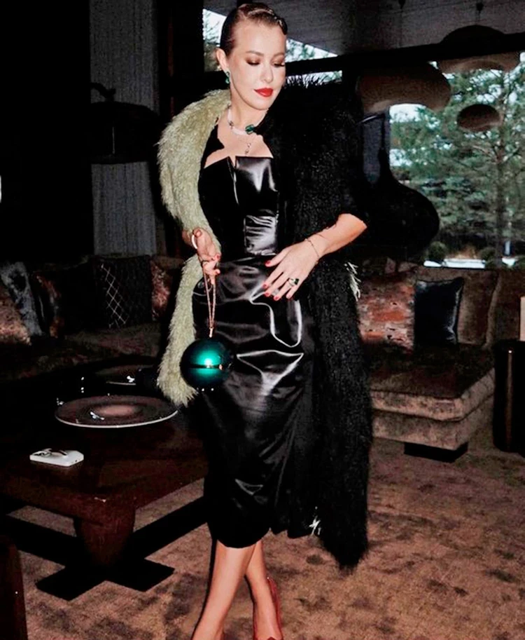 Ксения продемонстрировала очередной роскошный лук. Драматическое кожаное платье от Maison Margiela звезда сочетала с меховым двуцветным пальто от одноименного бренда своей подруги Ульяны Сергеенко. А в руки Собчак взяла кутюрную сумку-шарик, тоже от Ulyana Sergeenko, которую подобрала в тон украшениям с изумрудами. Ну, очень дорогая женщина!