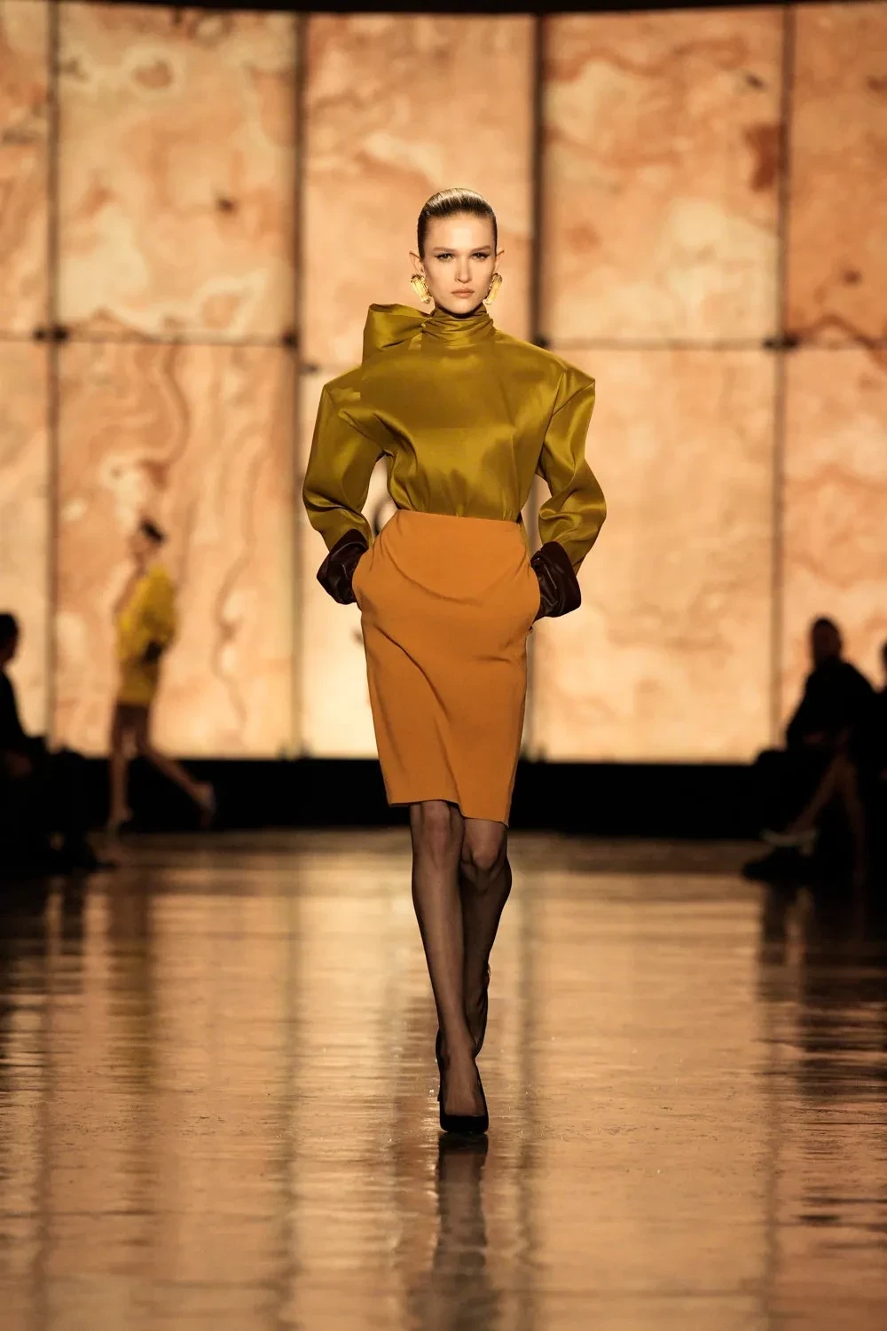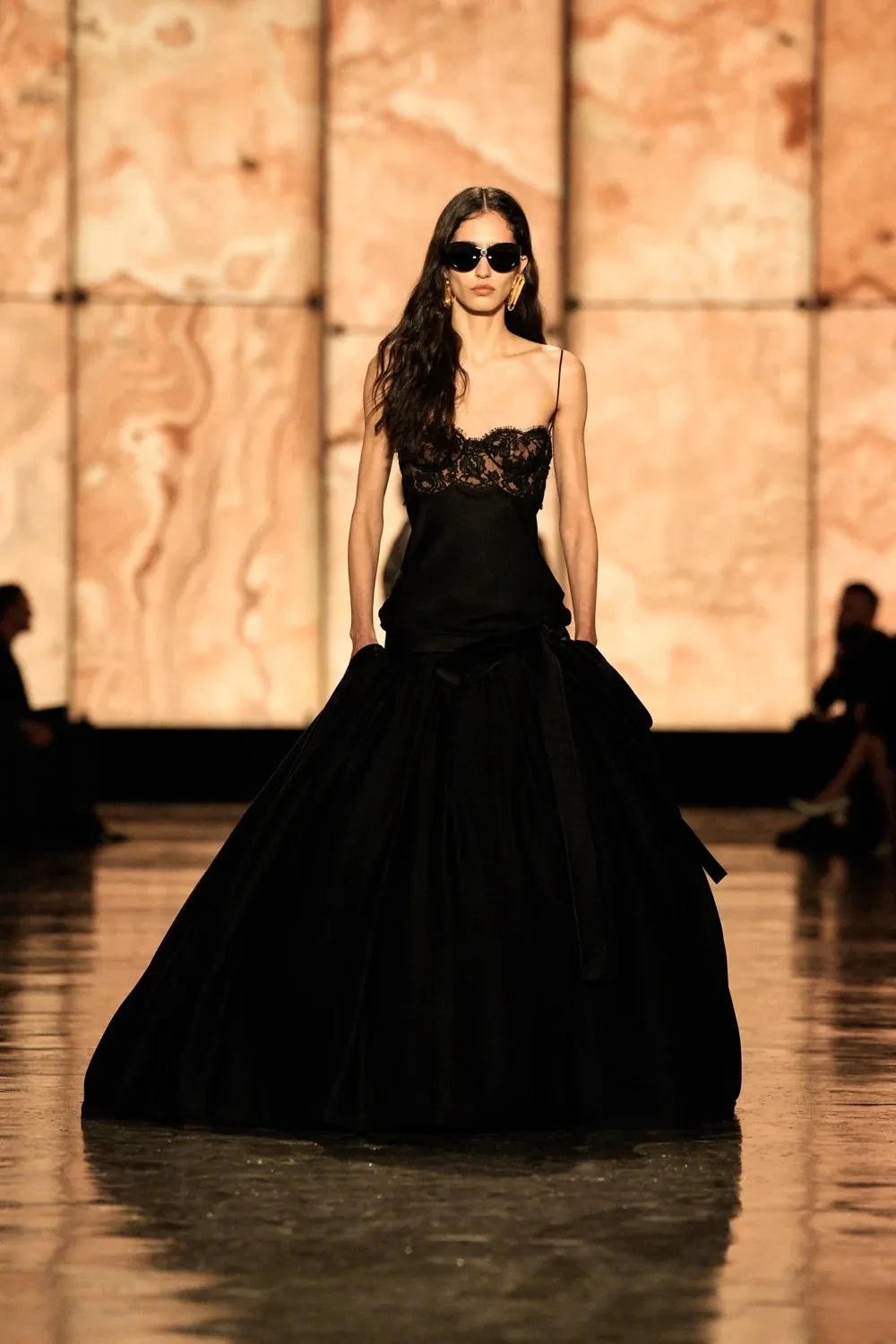 По подиуму прошлись Белла Хадид и обладательница титула "Модель года — 2024" Анок Яй, которые пропустили весь сезон и вышли только на шоу Saint Laurent. Анок перед показом сменила имидж и побрилась налысо.