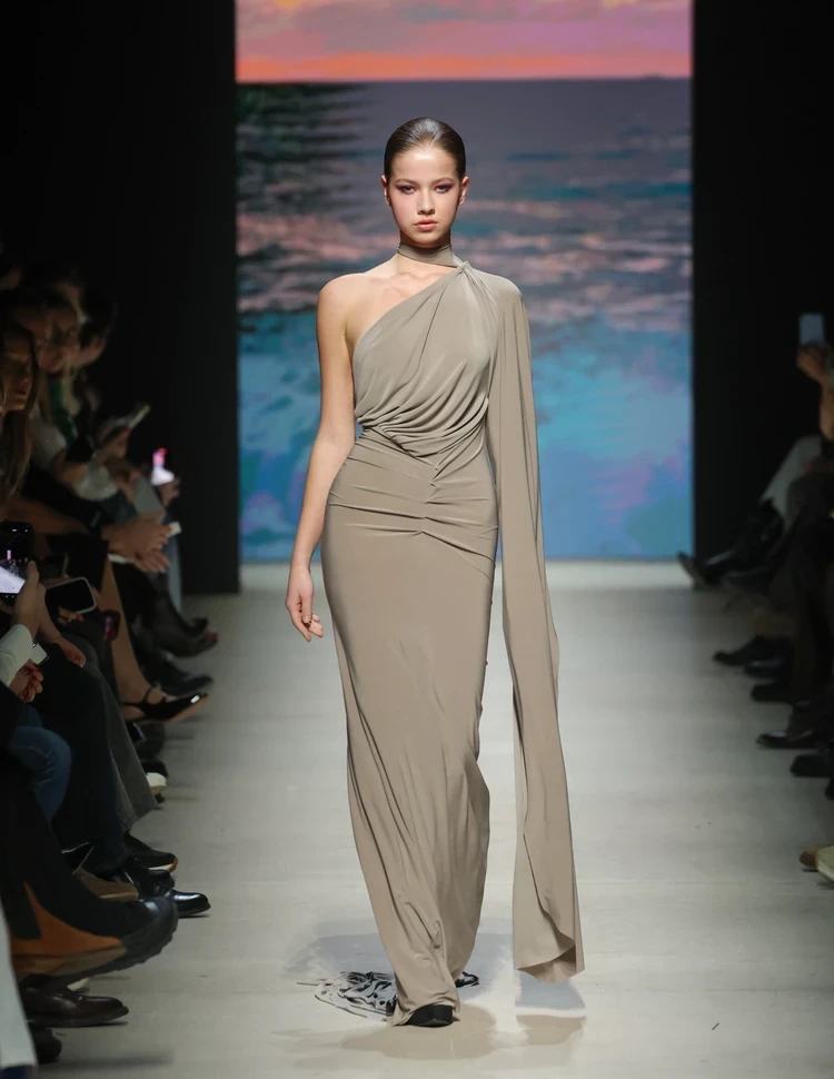 Главной звездой показа российского бренда Solangel (Москва) под руководством Ирены Сопрано стала известный блогер Дина Саева. На подиуме 25-летняя Дина появилась в вечернем алом платье в пол. В этот раз Ирена, которая специализируется на вечерних платьях, сделала упор на наряды с традиционными русскими мотивами.