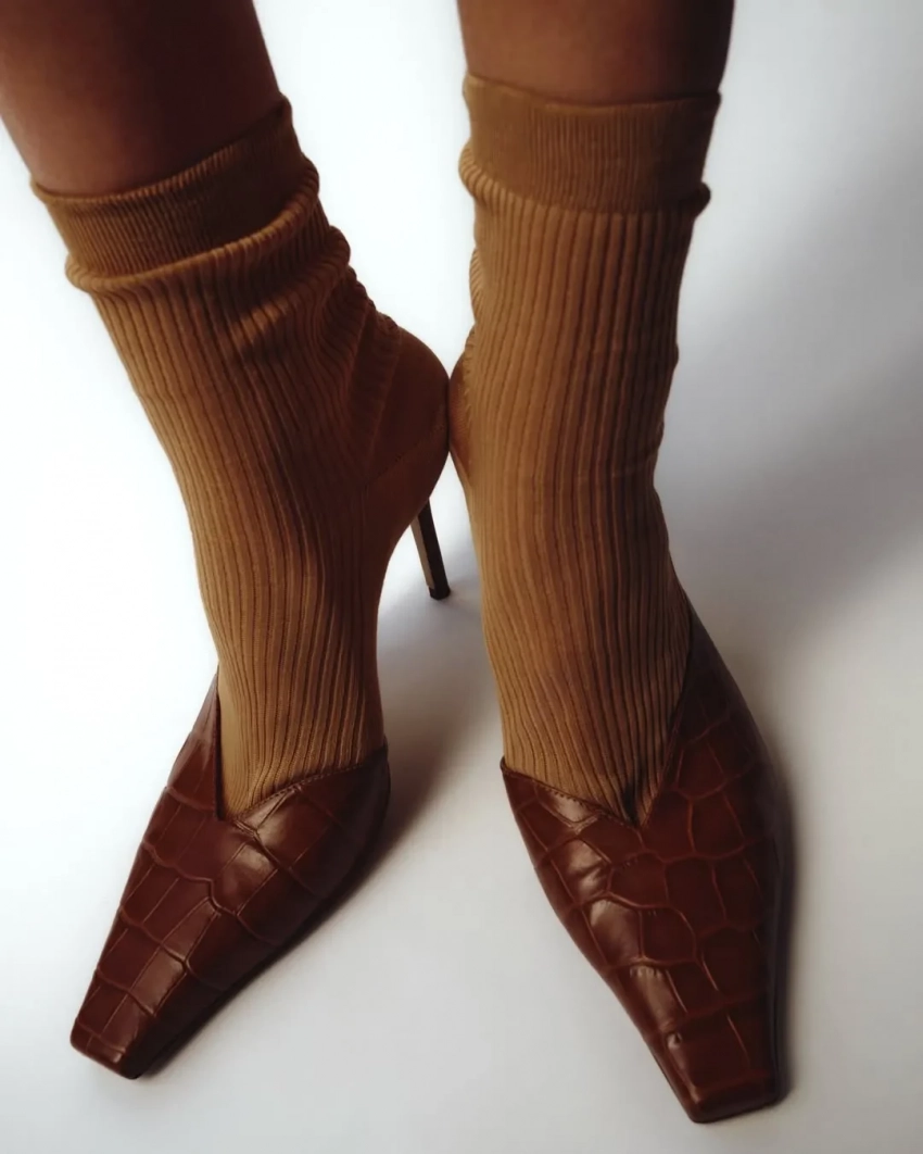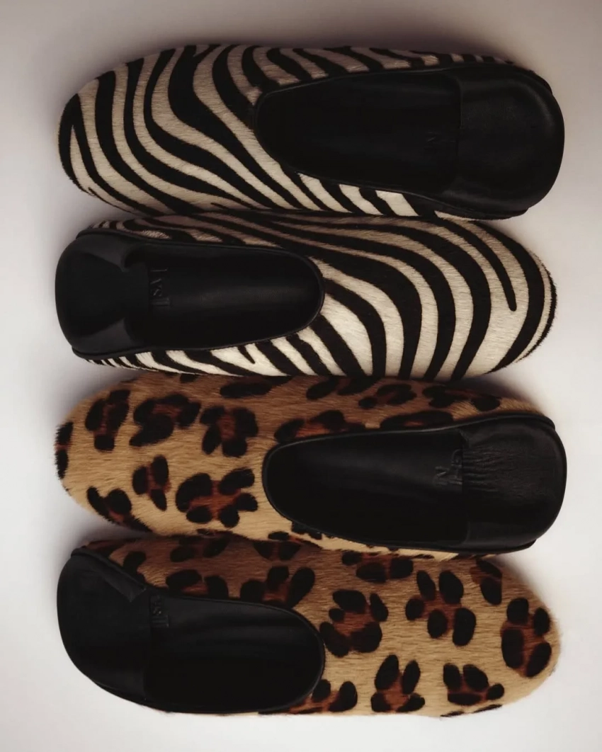 В коллекцию, для которой модели пришлось полностью раздеться, вошли классические лоферы, мюли на каблуке в зебровой и змеиной расцветке, а также обувь на плоской подошве в сетку и с хищным принтом.