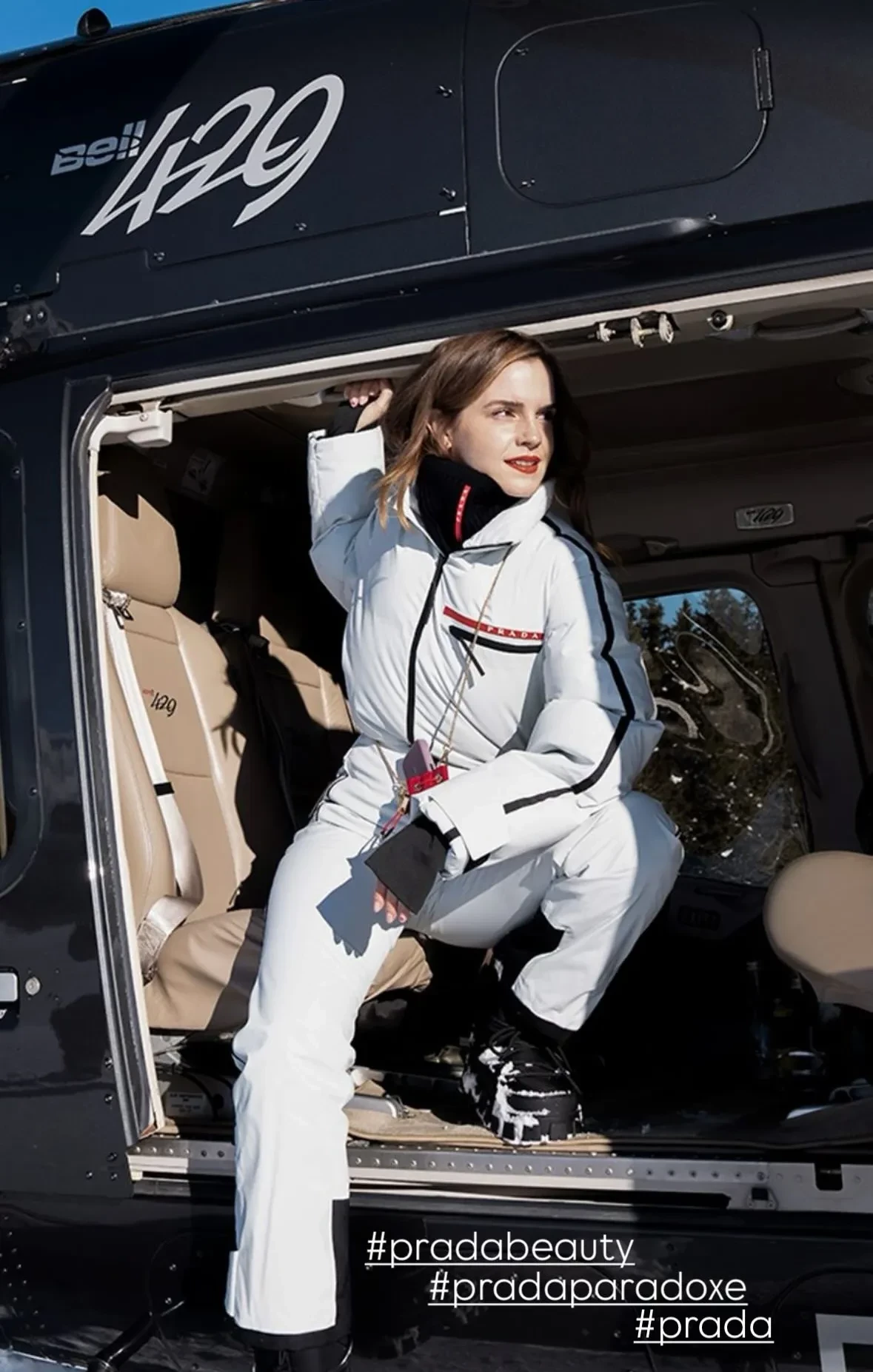 Звезда "Гарри Поттера" Эмма Уотсон снялась в новом кампейне аромата Prada Paradoxe, лицом которого она является с 2023 года. На снимках 34-летняя актриса в белом горнолыжном комбинезоне Prada и с красной помадой на губах позирует на склонах швейцарских гор в Церматте в вертолёте и с лыжами.