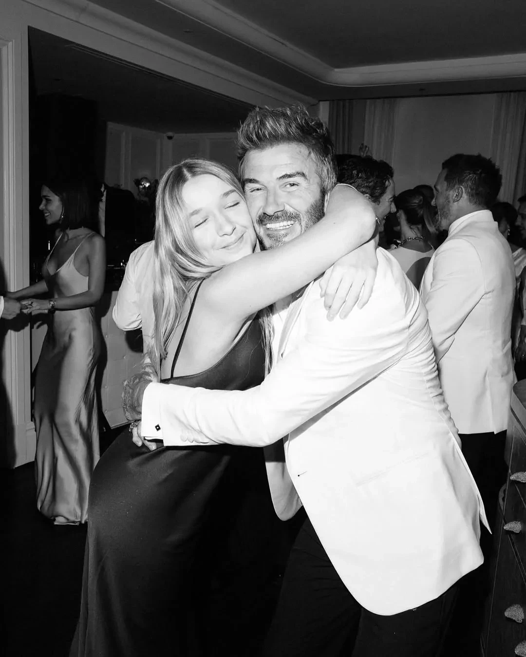 На кадрах футболист позирует в белом смокинге вместе с женой и младшими детьми: 22-летним Ромео, 20-летним Крузом и 13-летней Харпер, а также танцует и веселится с друзьями. Виктория для вечера выбрала белое асимметричное платье, а Харпер надела красное платье-комбинацию.