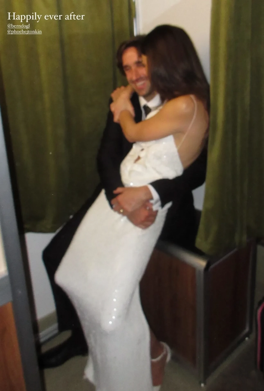 Во время церемонии невеста была одета в Magda Burtym, а после сменила белый наряд на платье с газетным принтом. Одна из близких подруг Фиби, 34-летняя Марго Робби, которая полгода назад стала мамой, пришла в красном мини-платье тоже Magda Burtym, а на вечеринку переоделась в наряд с леопардовым принтом.