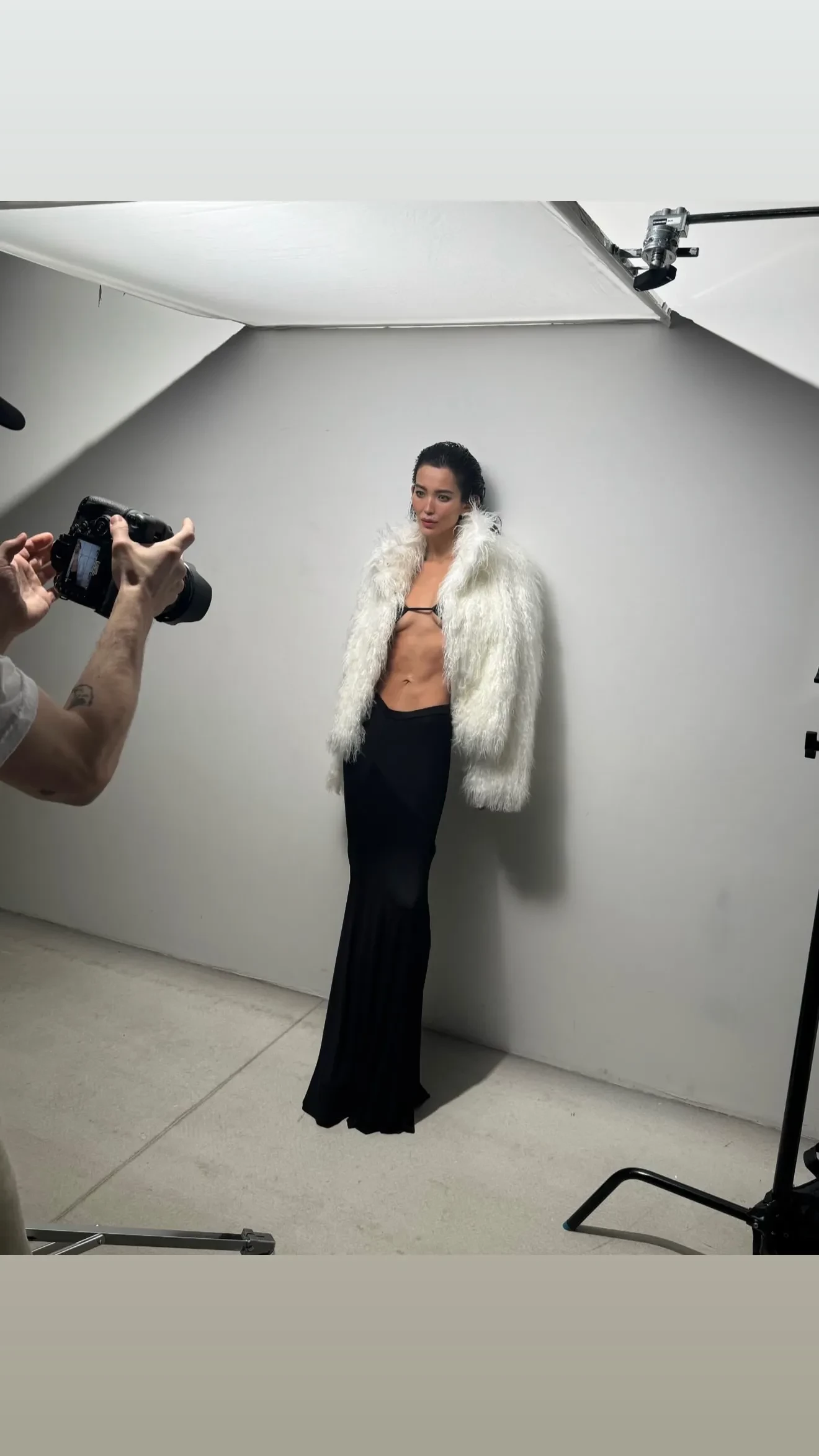 На снимках Дарина позирует в длинной юбке и топе, на некоторых кадрах сверху она надела шубу.