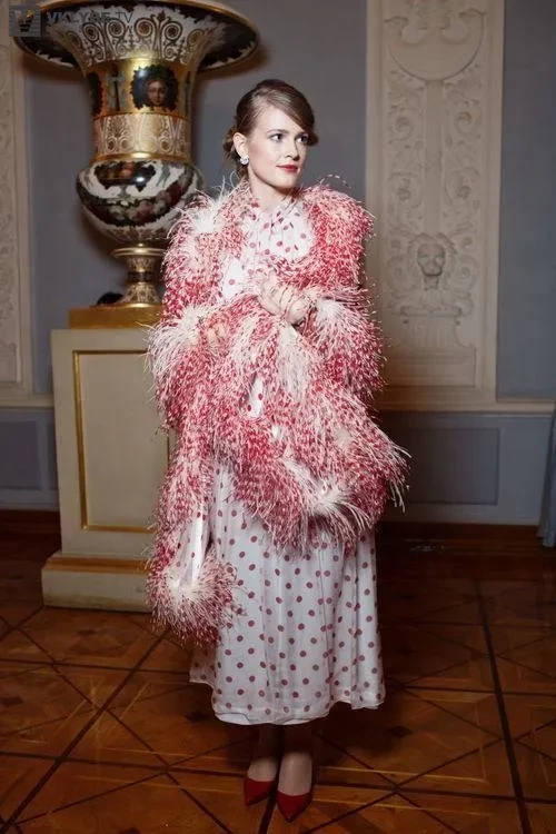 Софья Эрнст вышла в свет в боа с перьями и кружевном топе