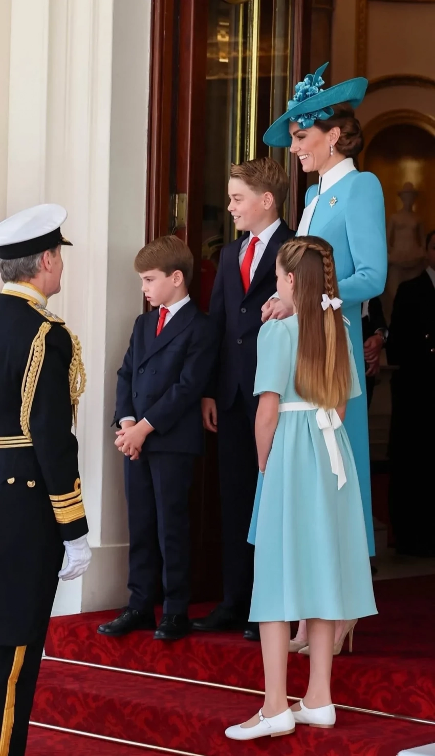 Кейт Миддлтон с детьмиПринц Уильям по традиции был в форме и верхом на лошади, а его супруга ехала в карете вместе с их тремя детьми: принцами Джорджем и Луи и принцессой Шарлоттой, на которой было платье в тон наряда ее матери. Карл III тоже предпочел занять место в карете из-за состояния здоровья: монарх сейчас лечится от онкологического заболевания.