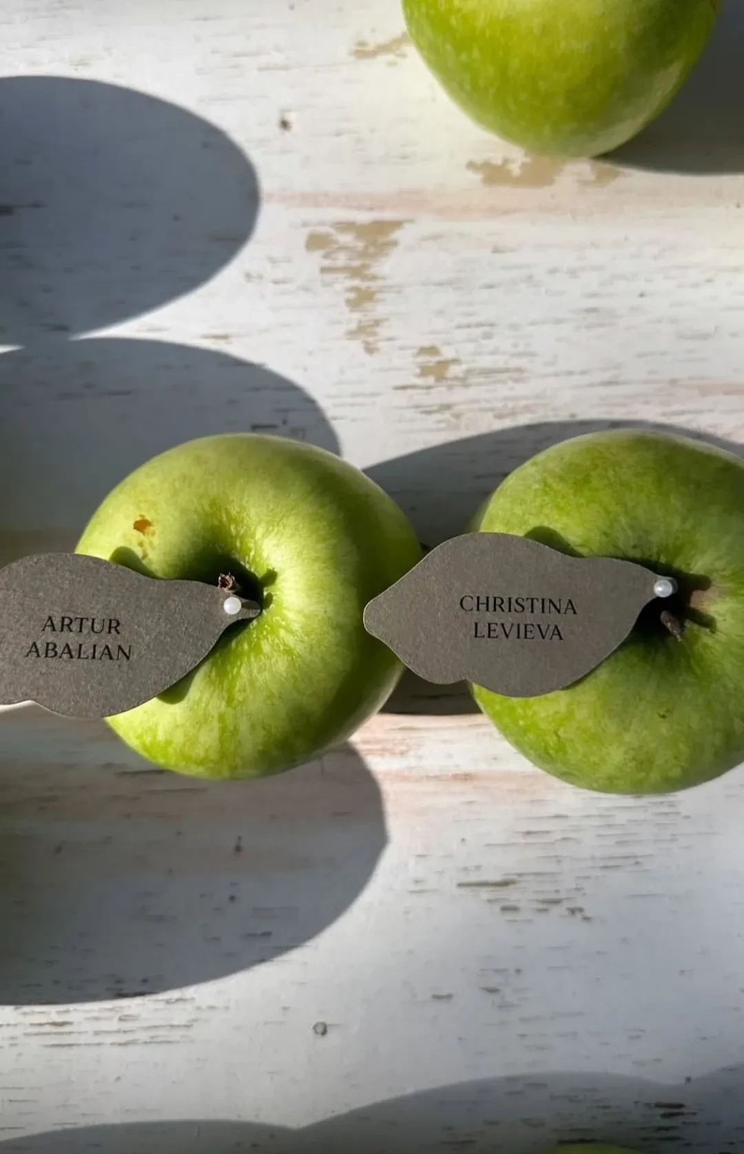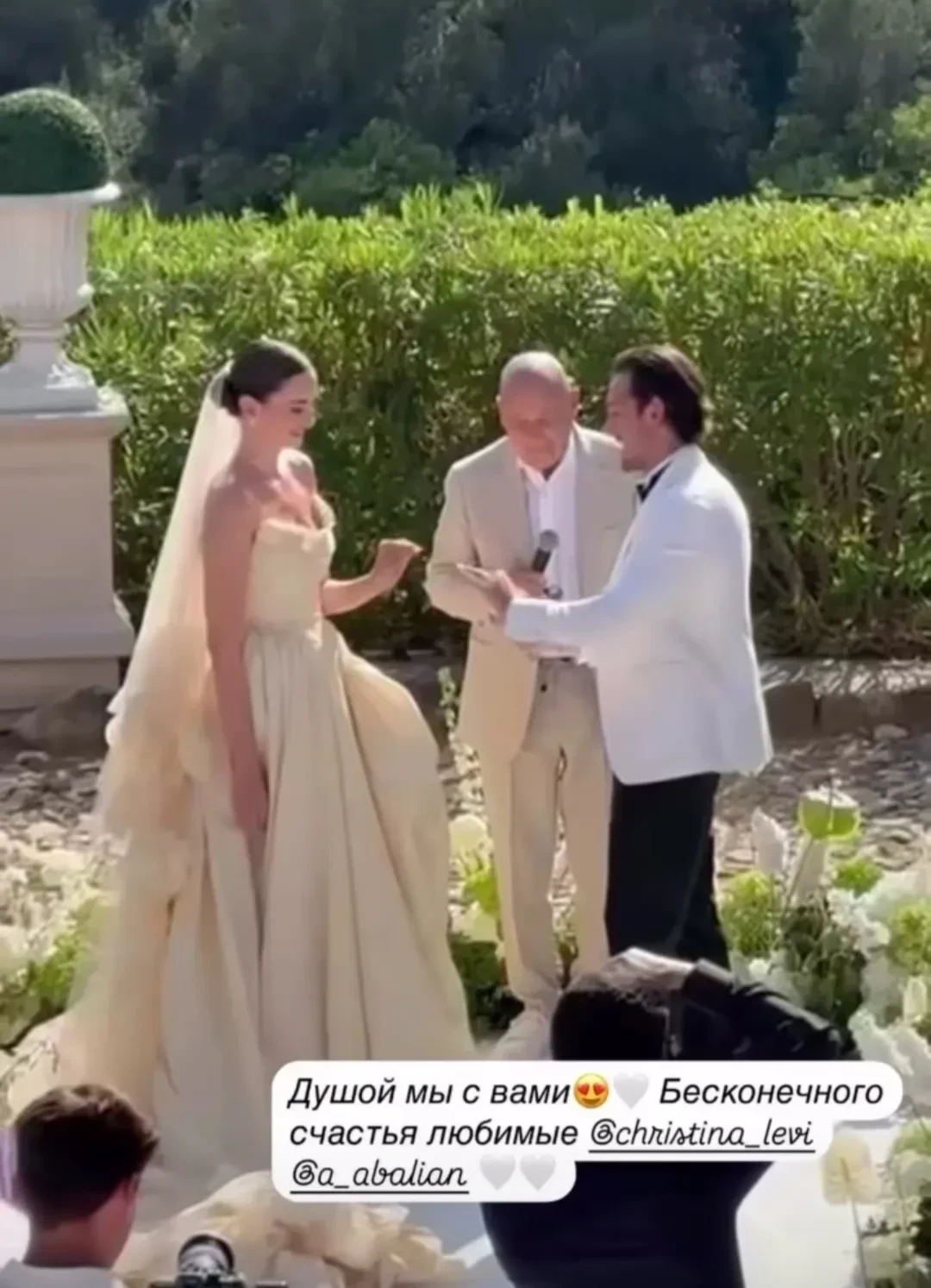 Кристина Левиева и Артур АбалянСтарший коллега Кристины, Владимир Познер, выступил в роли распорядителя клятв. Он спросил у жениха и невесты на английском языке, готовы ли они сочетаться браком, и, когда те ответили согласием, предложим им обменяться кольцами.