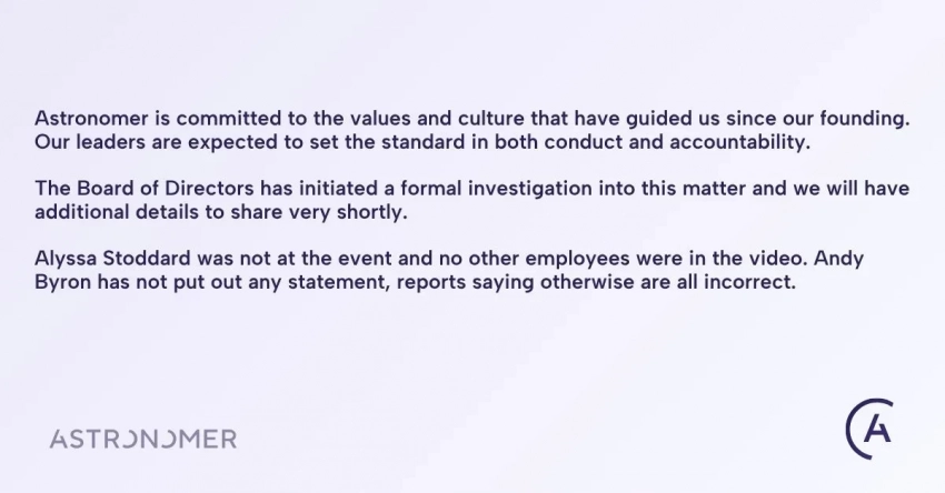 "Astronomer придерживается ценностей и культуры, заложенных с момента основания. Мы ожидаем, что наши руководители задают высокие стандарты поведения и подотчётности. Совет директоров уже инициировал официальное расследование, и в ближайшее время мы расскажем больше. Подчёркиваем: ни один сотрудник компании не попал на видео", — заявили в Astronomer.