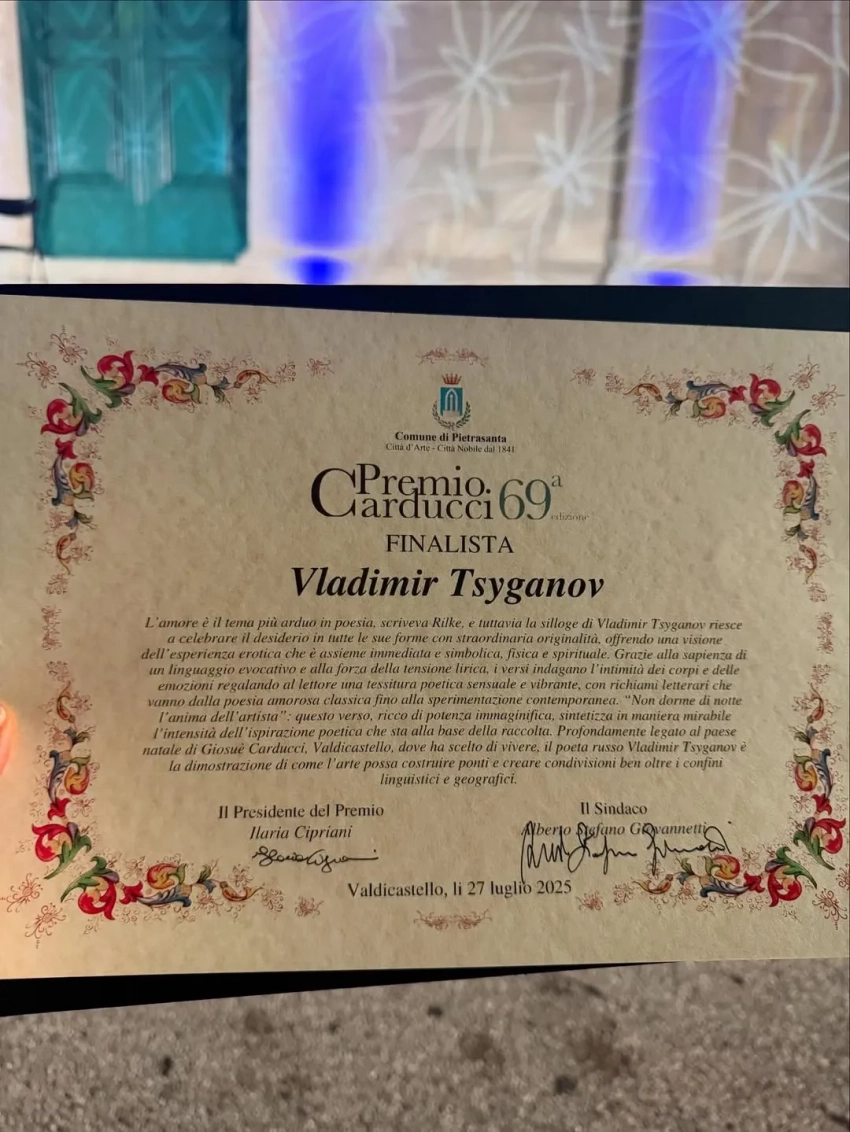 "Горжусь любимым поэтом". Оксана Бондаренко поддержала мужа Владимира Цыганова на вручении поэтической премии в Италии